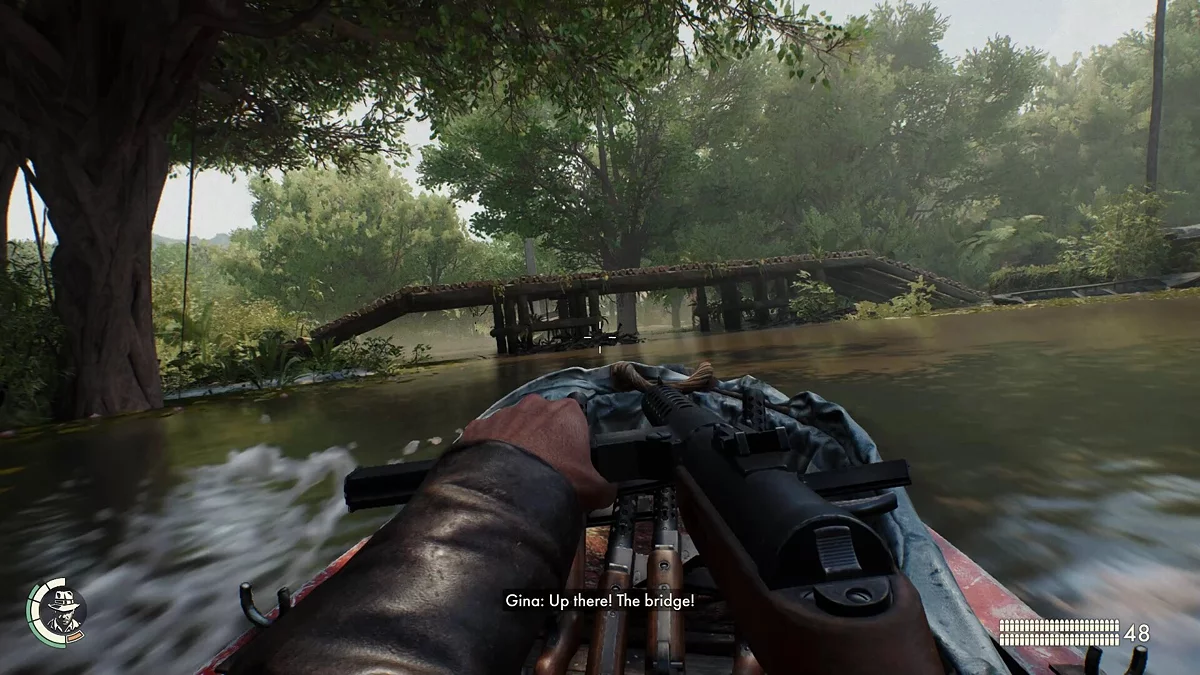 После продолжительной катсцены бегите в обратном направлении и пролезайте через каменные колонны. Теперь нужно будет отстреливаться от нацистов огнестрельным оружием, находясь в лодке. Взаимодействуйте с корзиной с фруктами, чтобы обнаружить автоматы.