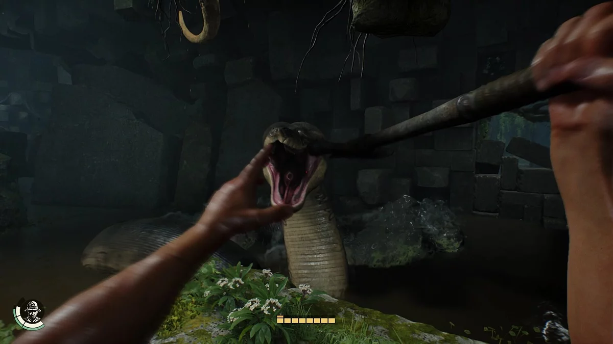 Для победы над огромным змеем подбирайте гарпуны, свисающие с потолка, и швыряйте в пасть твари в момент, когда она будет пытаться атаковать главного героя. Цельтесь точно в пасть: если взять немного выше или ниже, вы нанесёте кое-какой урон, однако этого будет недостаточно.