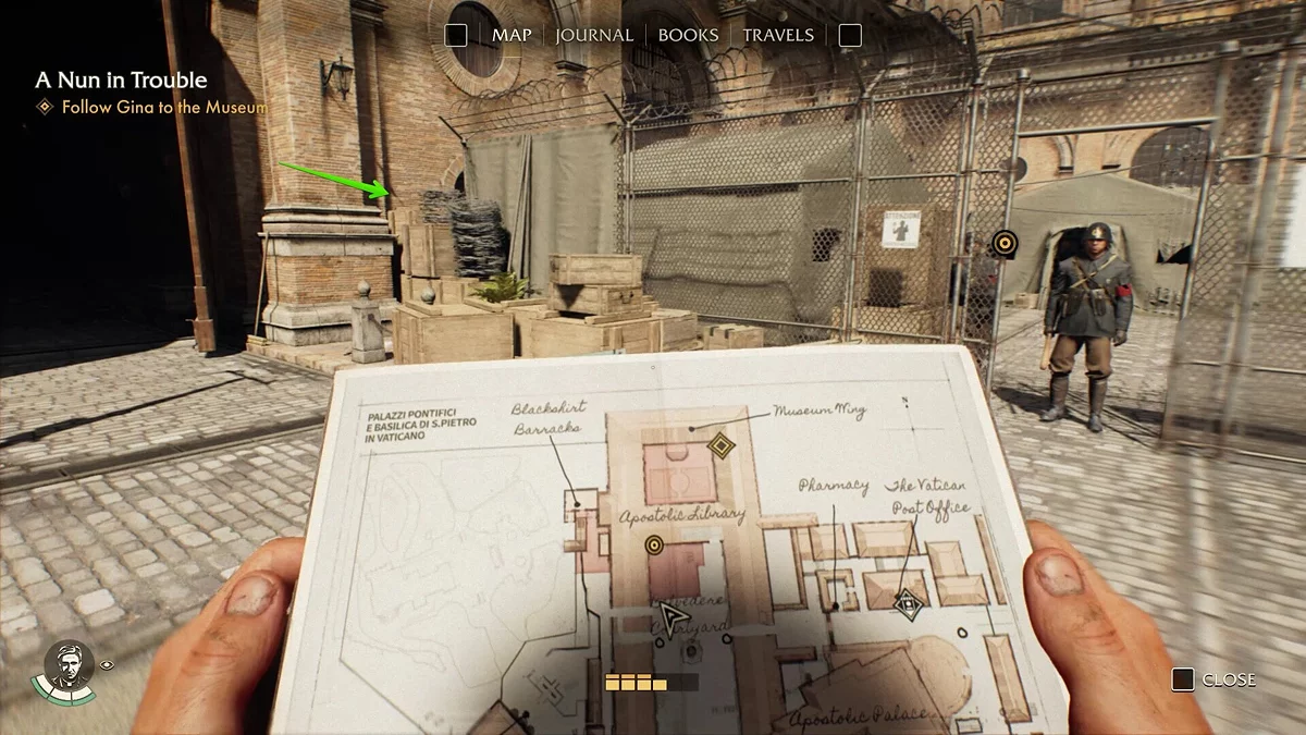 Недалеко от главного входа находится небольшой пандус, который ведет в подвал почтового отделения Ватикана. Вам предстоит отправиться туда, когда вы найдете несколько каменных обломков. Как только вы завершите это поручение, вас прервет группа чернорубашечников. Не упустите шанс обыскать их тела, на которых вы обнаружите записку с кодом от сейфа.