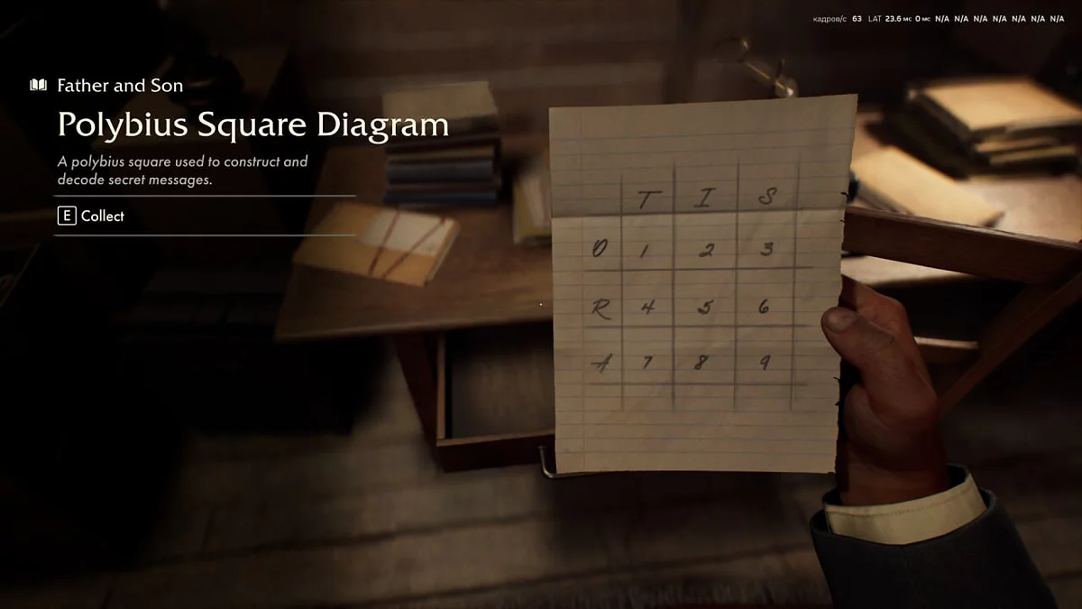 Изучив карту, обратите внимание на эти координаты: I-R, I-A, T-A и S-O. Они помогут вам получить код 5873. Внутри вы найдете секретные документы, в которых обведены восемь букв, а также таблицу шифров.