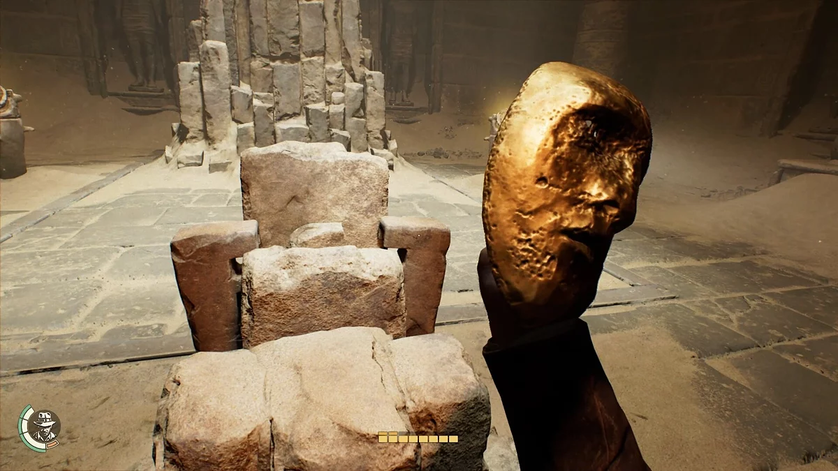 Подберите золотую маску и смотрите катсцену, в которой Джина присаживается на трон, а затем огромная каменная плита вместе с героями проваливается на несколько уровней вниз.