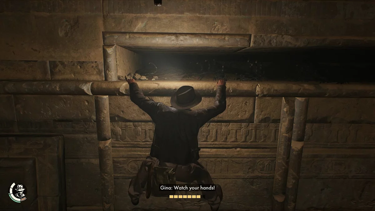 Вернувшись к Джине, используйте зажигалку на чаше с маслом и взаимодействуйте с рычагом. Во время катсцены девушка поможет избежать смерти, однако теперь предстоит отыскать вход в святилище. Единственный путь — использовать кнут и забраться в узкое пространство между плитами там, где отодвинулась каменная плита. Когда проползет вперёд, сможете отыскать цепь, при помощи которой Инди поднимет решётку внизу.