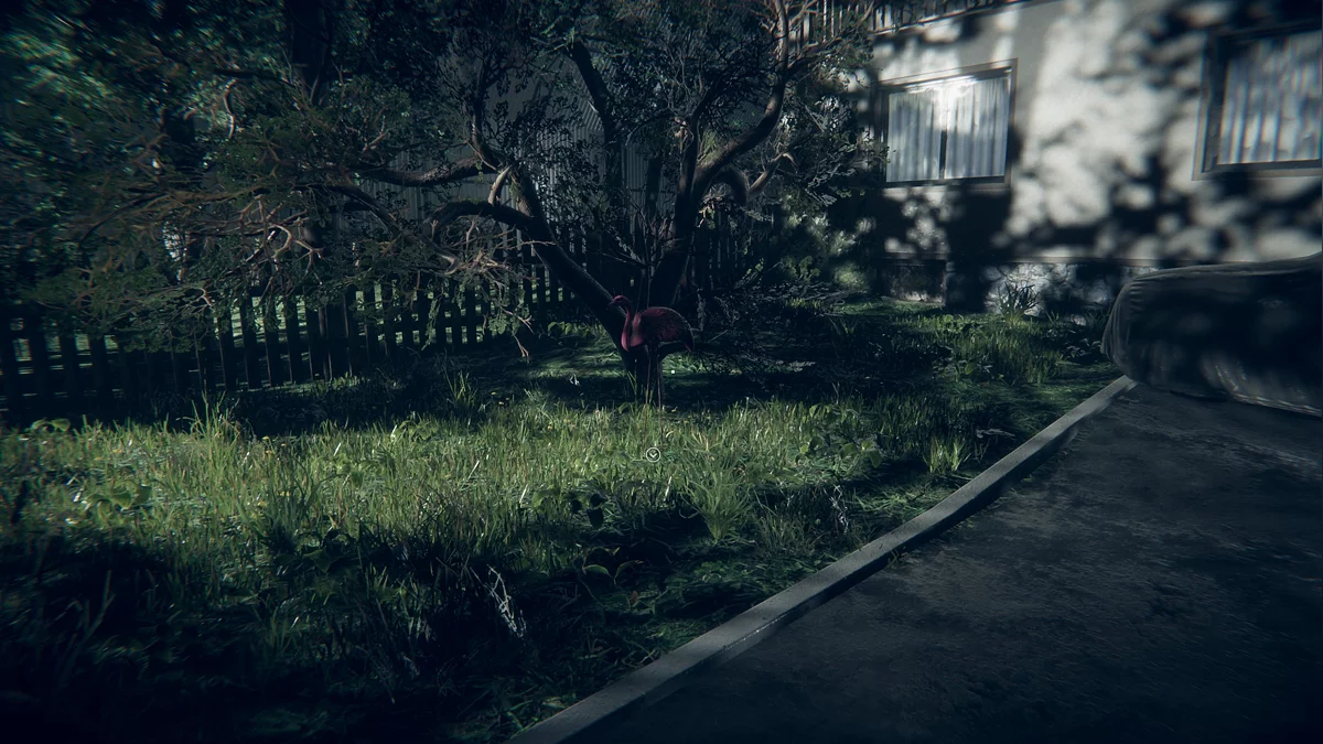 Всё ещё не садясь в машину, вернитесь к дому. Фламинго стоит на лужайке возле дерева и накрытой машины.