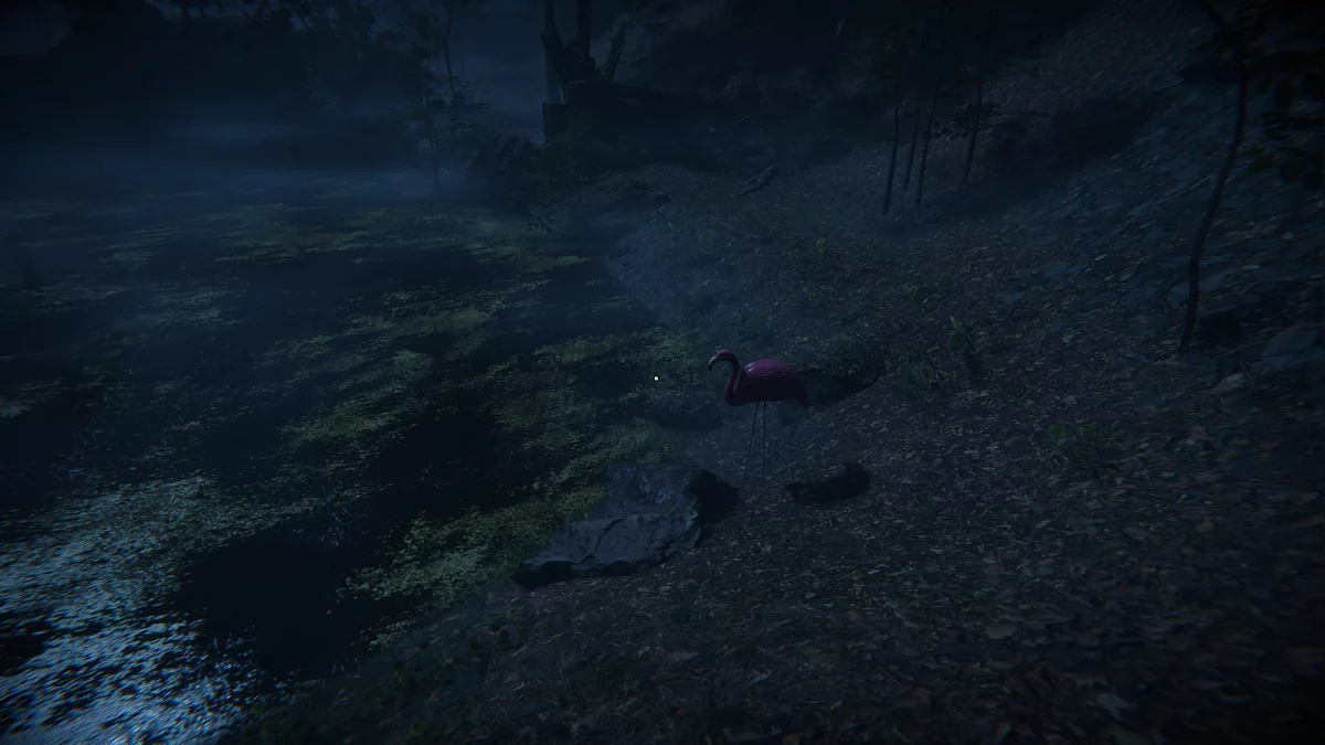 Дойдя до дома, не сворачивайте и продолжайте двигаться по дороге. Фламинго расположен возле сгоревшего сарая, чуть дальше основного дома.