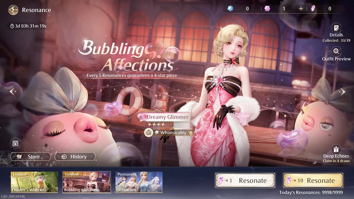 В игре есть три баннера: два ивентовых с нарядами четырёхзвёздочной редкости и один с несколькими пятизвёздочными на выбор. Для разных баннеров нужны разные виды круток. Сами наряды собираются по частям: то есть за одну крутку можно получить лишь одну часть аутфита. Всего их обычно 8-9, иногда меньше или больше. Однако гарант, в отличие от других игр, более щадящий: в ивентовом баннере вещь нужной редкости выпадает раз в пять круток (гарантированно), а в стандартном — легендарная может попасться примерно раз в 20 круток, а четырёхзвёздочная также раз в пять.