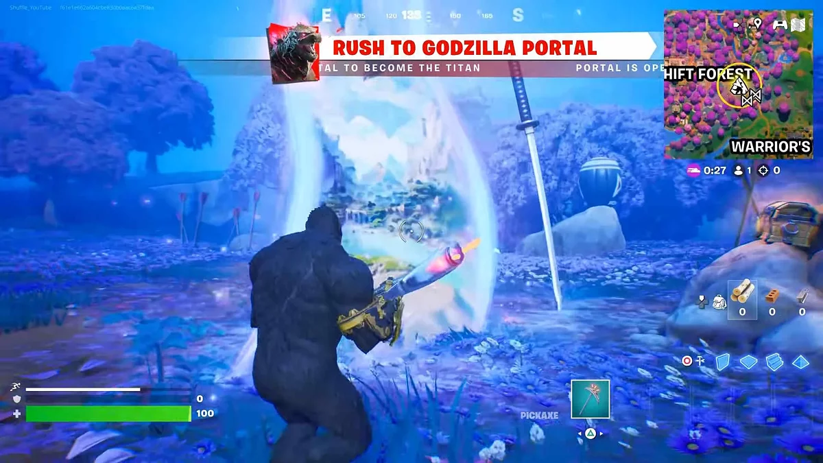 Чтобы стать гигантским Годзиллой в игре, необходимо найти портал Годзиллы, который может открыться в начале матча. Однако его появление на карте — это рандом, и он не появляется в каждом раунде. Обычно портал можно обнаружить один раз за несколько десятков матчей.