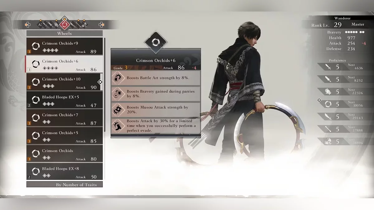 Багровые орхидеи +6 — заточенные обручи или чакрамы также 3 класса редкости. Они увеличивают силу специальных приемов и увеличивают прирост очков храбрости в случае идеального парирования.