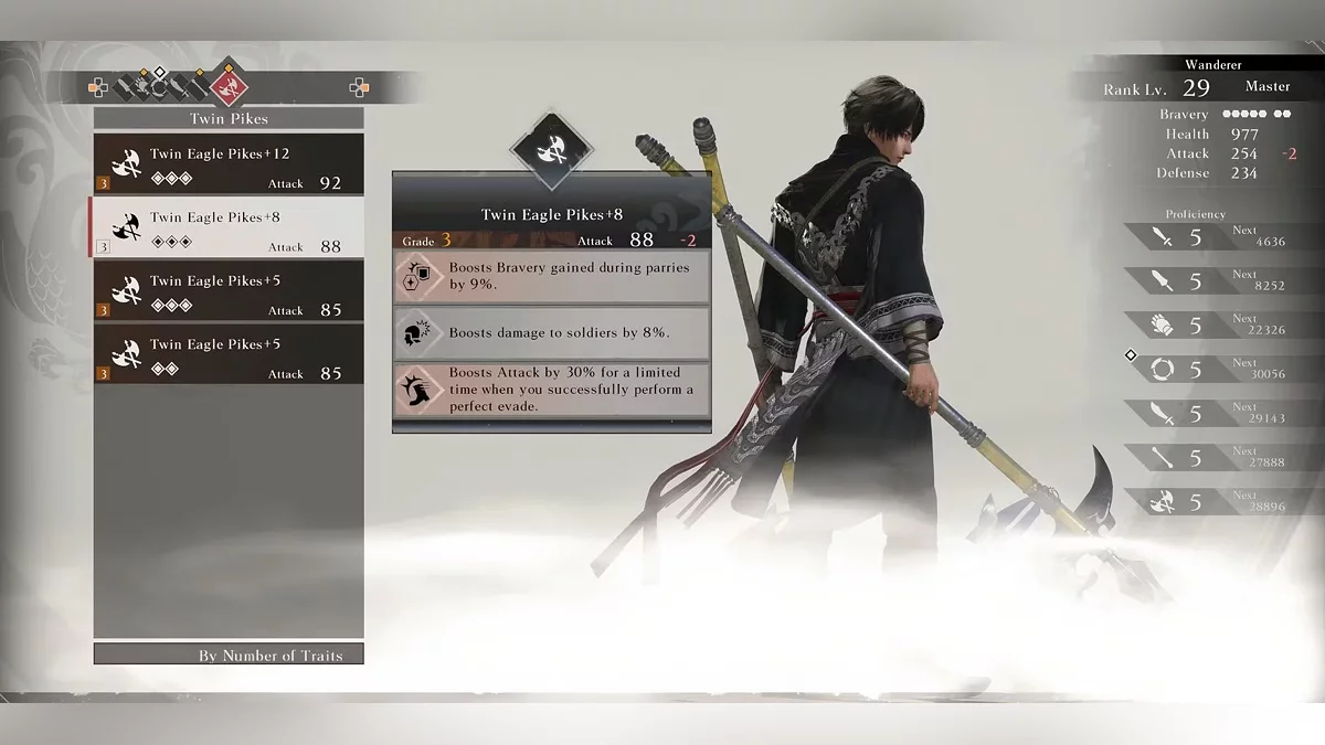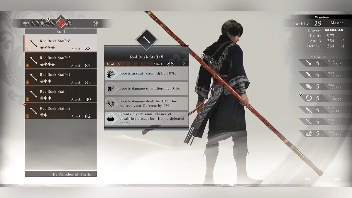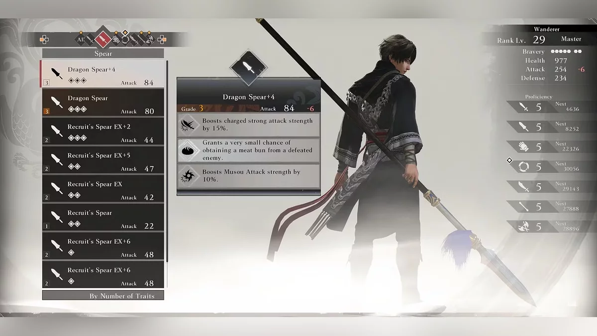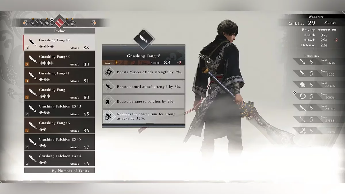 Всего в игре насчитывается 10 видов оружия: меч, копье, латные рукавицы, колеса, подао, посох, парные пики, пика, серповидный клинок и алебарда. В начале прохождения вы в любом случае начнете с меча, однако уже после первого часа-двух соберете тонну снаряжения. Имейте в виду, что некоторые виды заточек открываются только по сюжету.