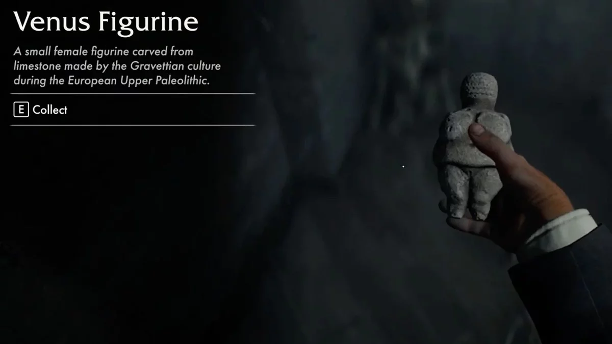 Используйте инструмент, чтобы разбить треснувший участок стены в комнате, где вы столкнулись с похитителем. Разбив стену, вы обнаружите скрытую область, заполненную костями. Среди них вы найдете статуэтку Венеры.