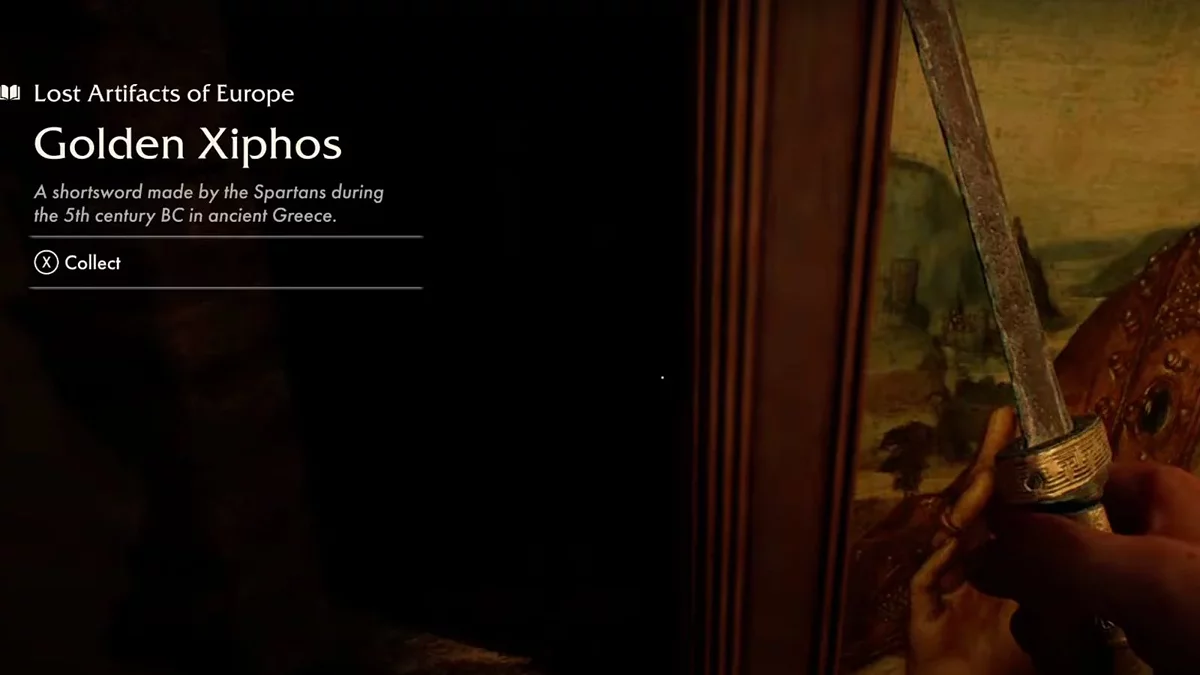В одном углу вы заметите перевернутую картину на стене. Взаимодействуйте с этой картиной и поверните ее правой стороной вверх. Когда вы это сделаете, картина сдвинется в сторону, открыв тайник, где лежит Золотой Ксифос.
