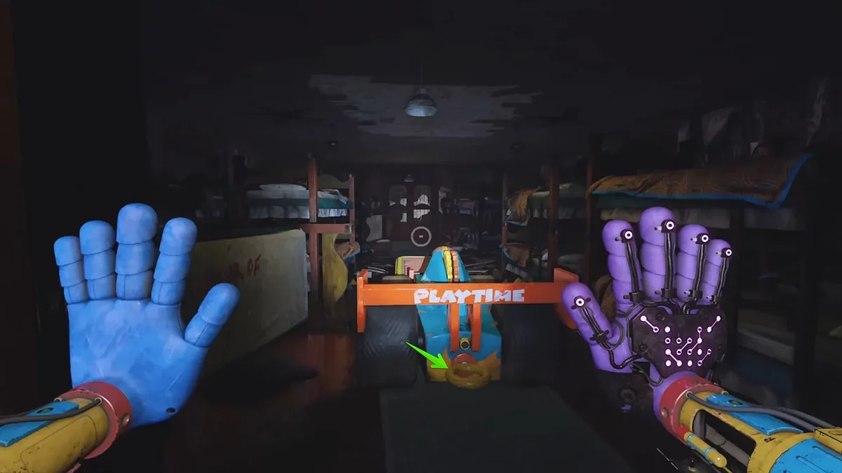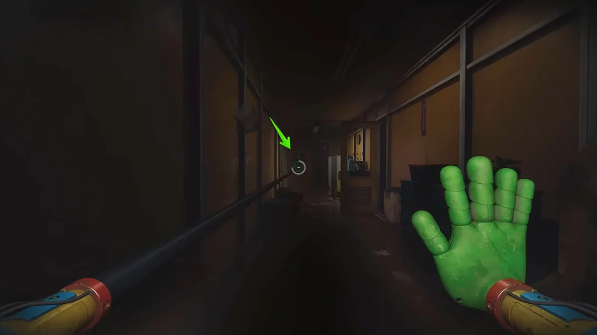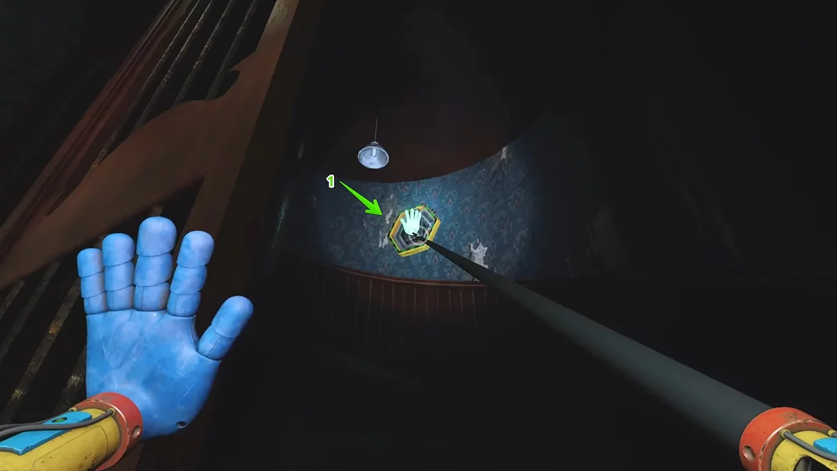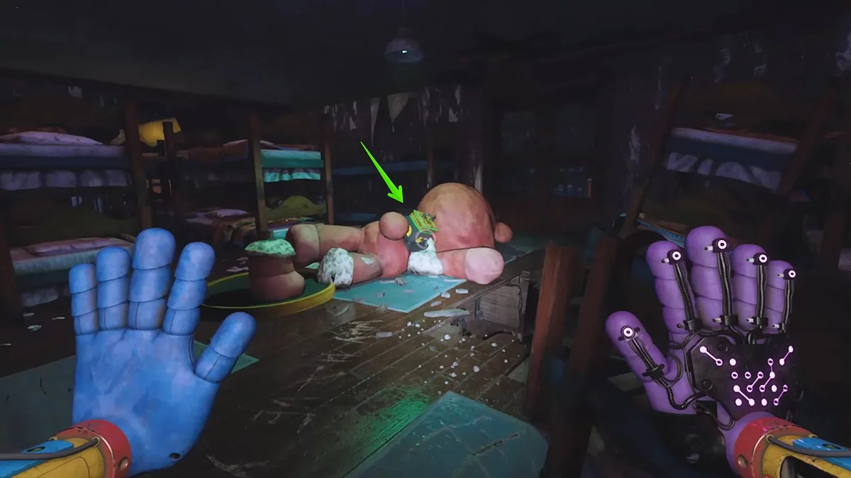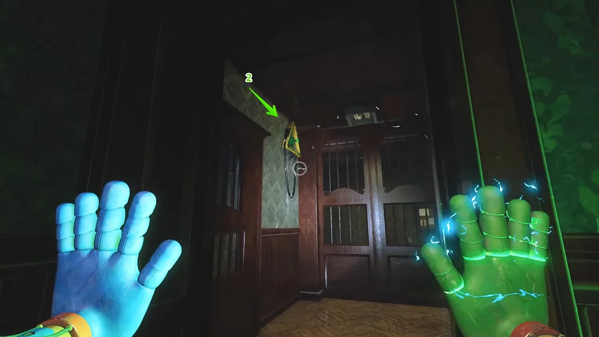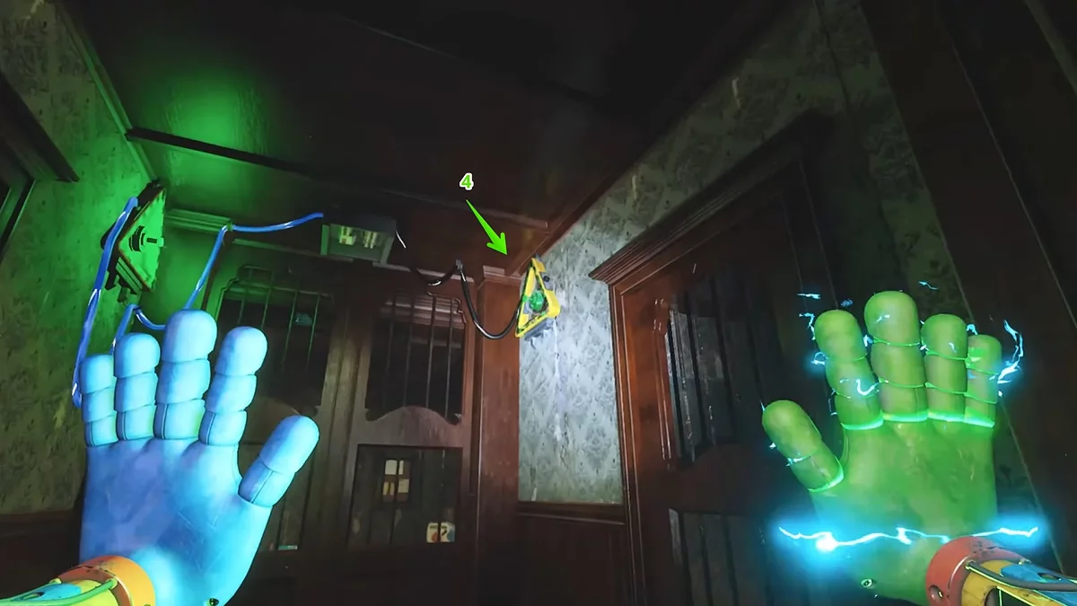 При помощи фиолетовой перчатки заберитесь выше, передвиньте шкафчик между комнатами и пройдите через соседний номер. В комнате с изображением солнца есть два слота для батарей, а также одна батарея. От этого помещения идите влево до конца и посмотрите наверх. Зацепитесь рукой, чтобы оказаться на верхнем этаже. Рядом с большой игрушкой будет лежать вторая батарея.