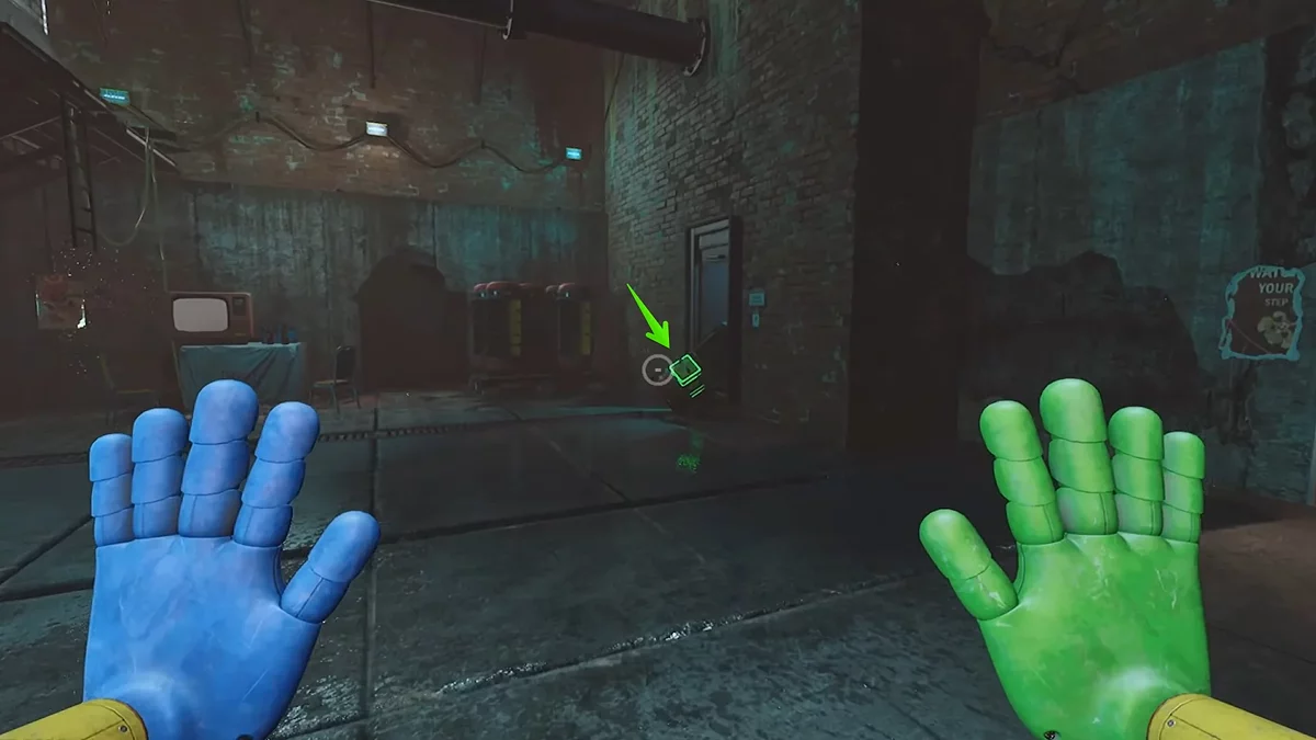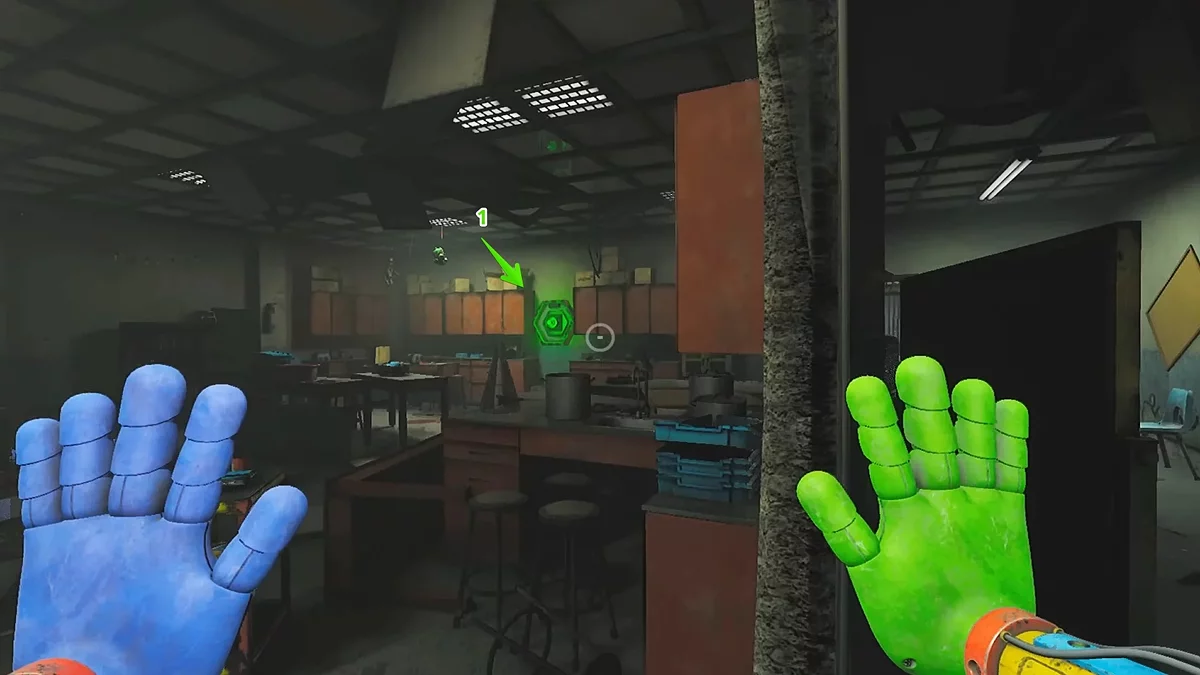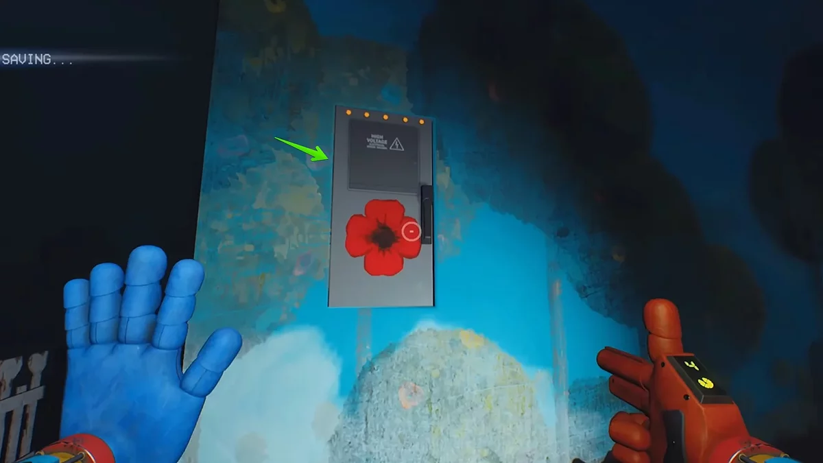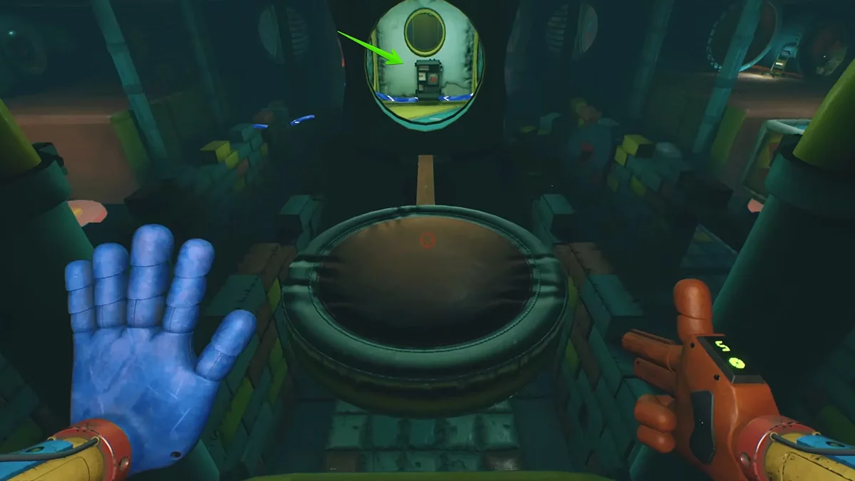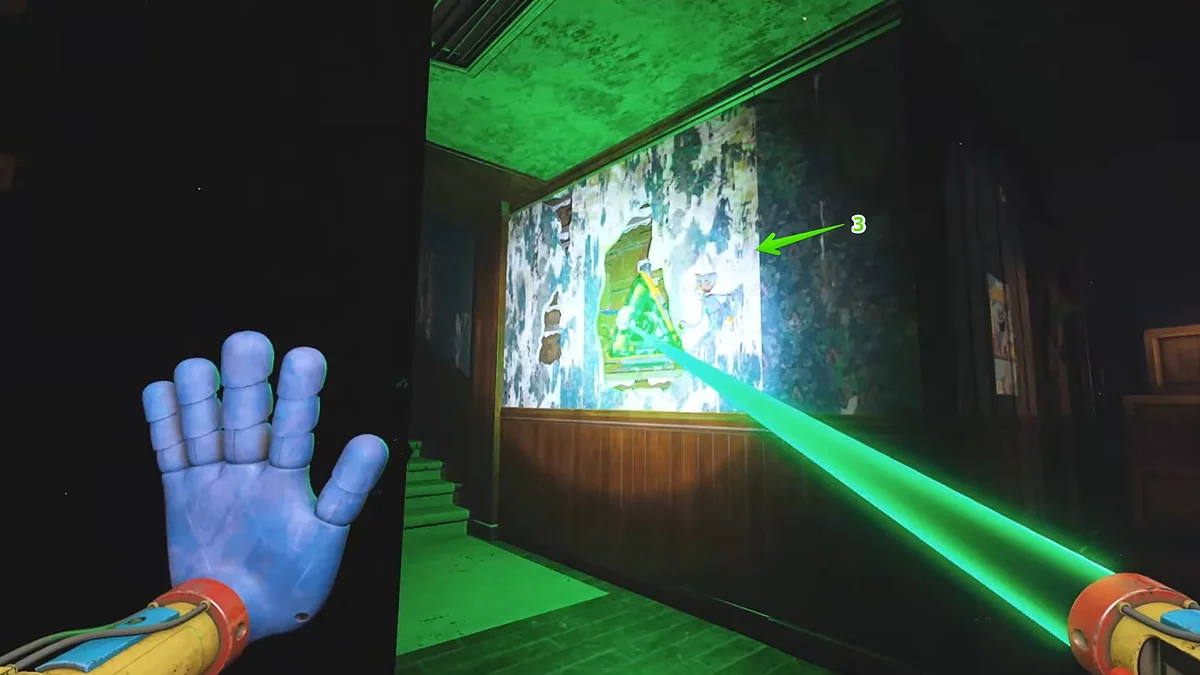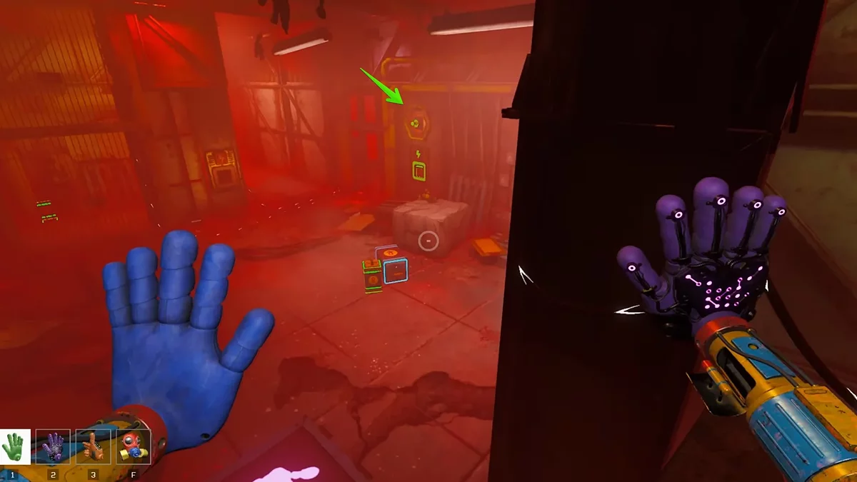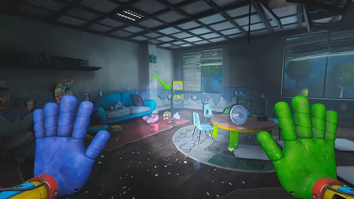 При помощи фиолетовой перчатки заберитесь выше, передвиньте шкафчик между комнатами и пройдите через соседний номер. В комнате с изображением солнца есть два слота для батарей, а также одна батарея. От этого помещения идите влево до конца и посмотрите наверх. Зацепитесь рукой, чтобы оказаться на верхнем этаже. Рядом с большой игрушкой будет лежать вторая батарея.