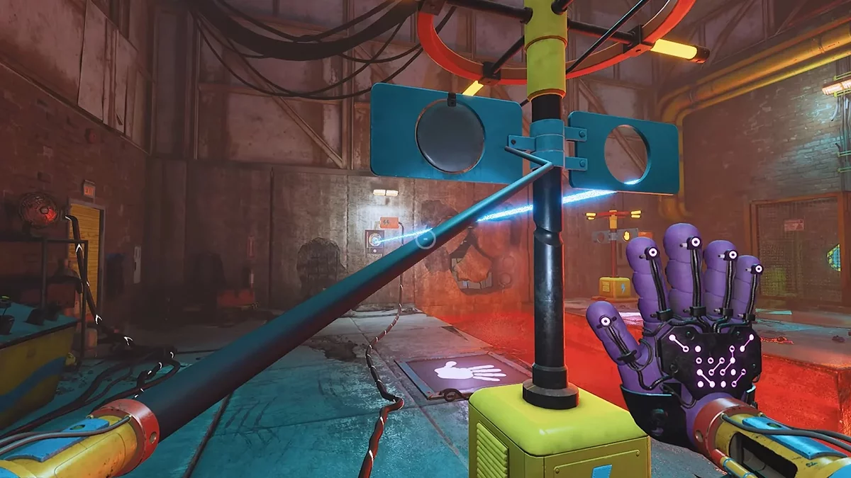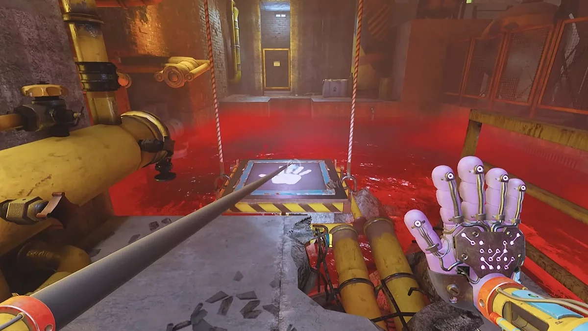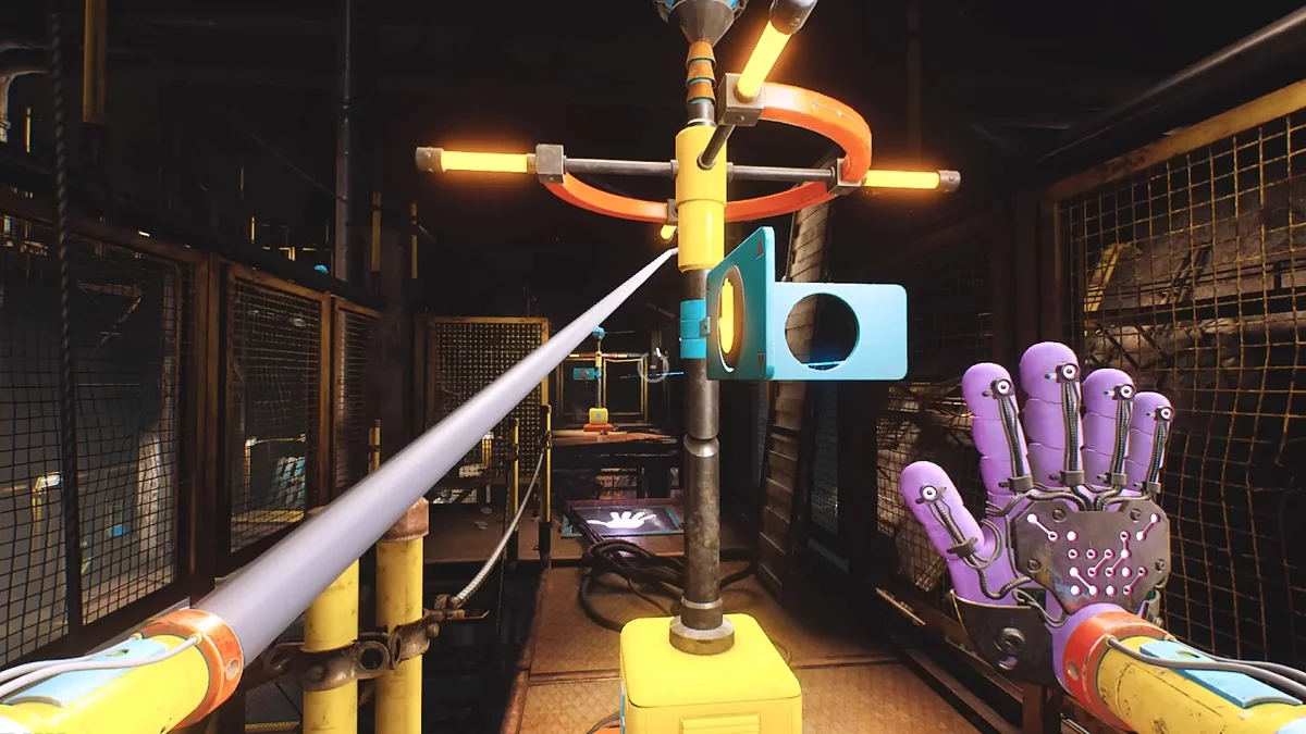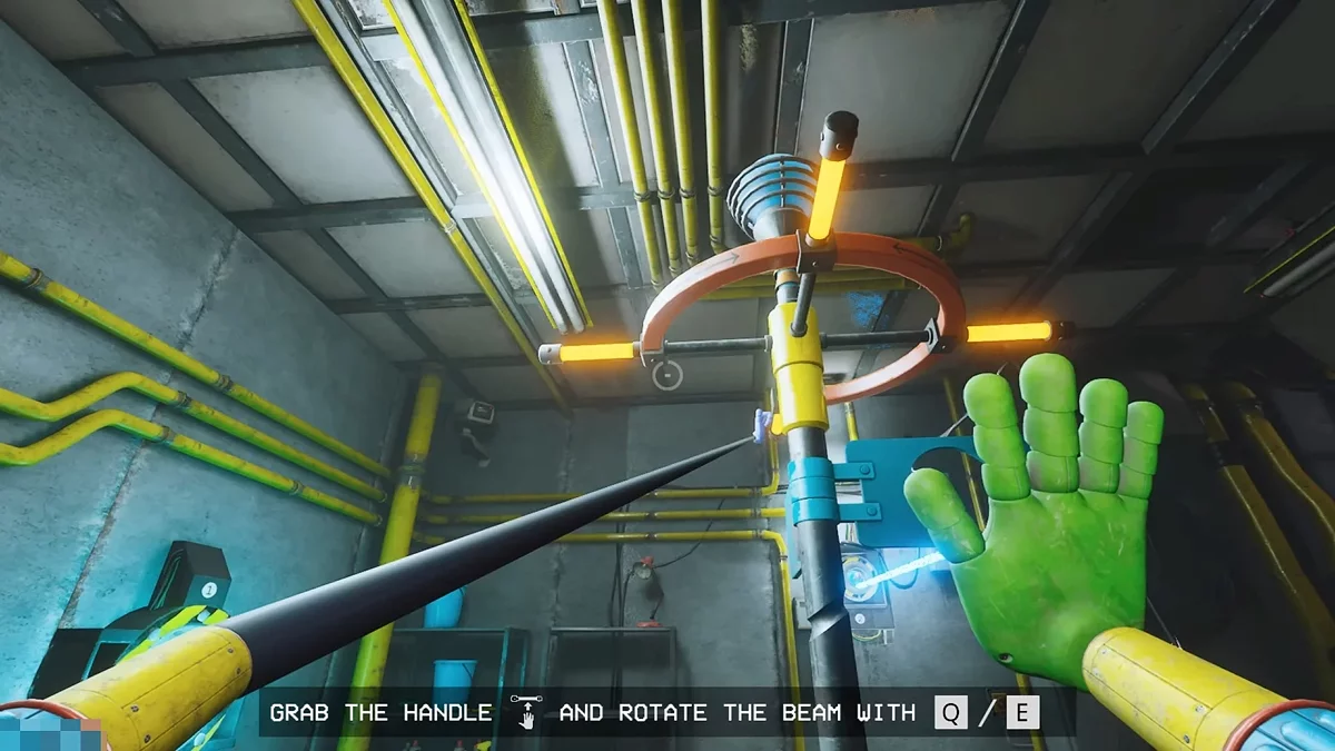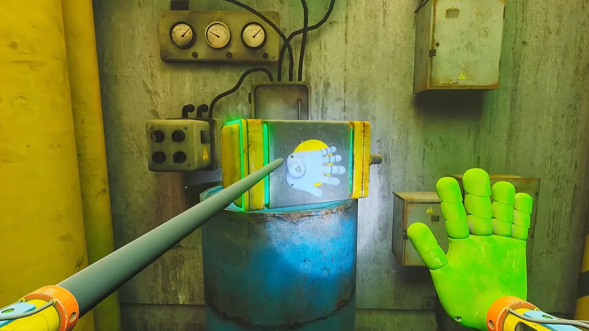 Выходите и с помощью фиолетовой руки подпрыгивайте выше (вы увидите соответствующее изображение на полу). В соседней комнате проделайте те же действия и подтяните к себе платформу, затем опустите её вниз. После подпрыгните на желтые трубы и схватите платформу, чтобы подтянуть её левее.