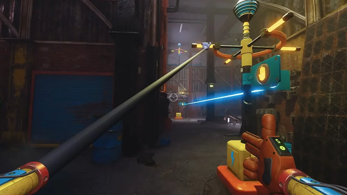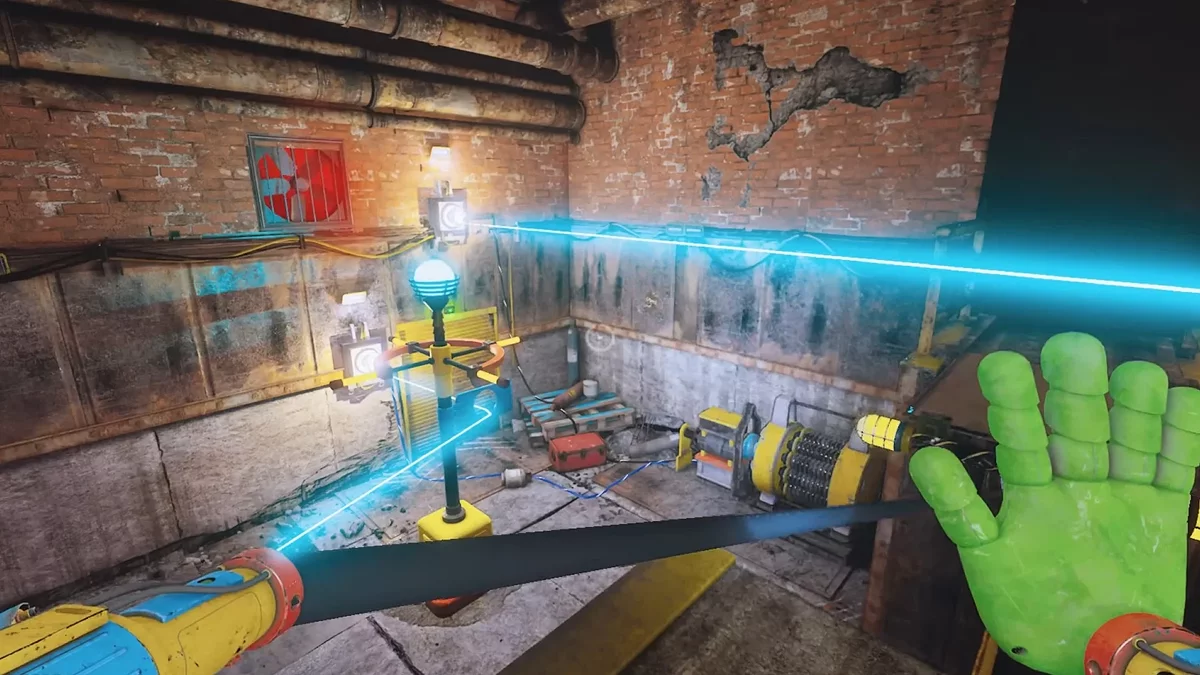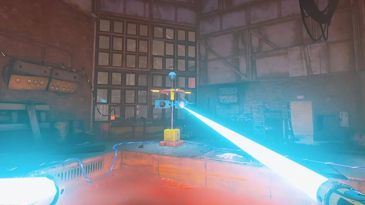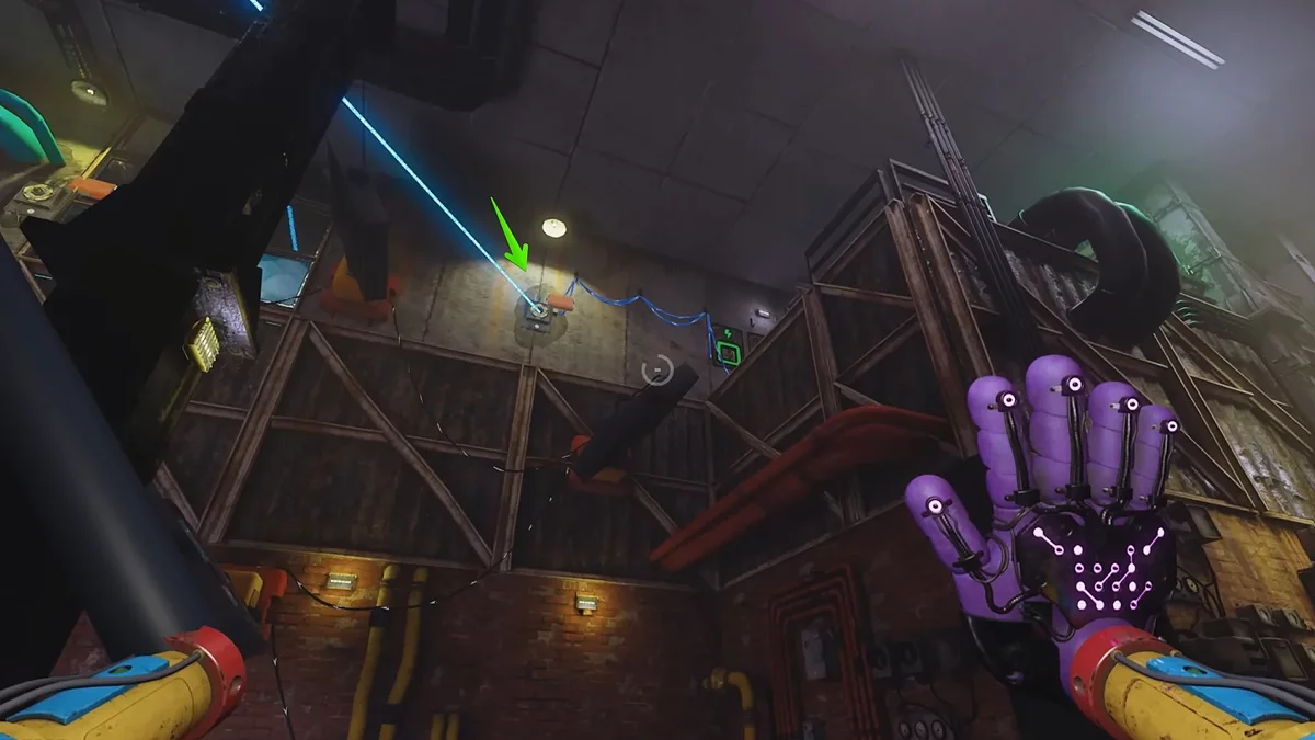 Поверните дальнюю стойку, чтобы луч был направлен на розетку. Вторая же стойка должна смотреть в сторону первой. Подпрыгните на батуте и взаимодействуйте с источником питания, затем направьте вторую руку во вторую стойку.