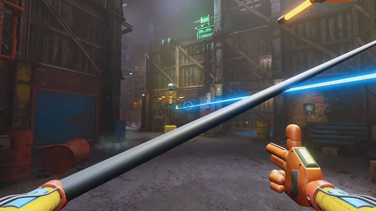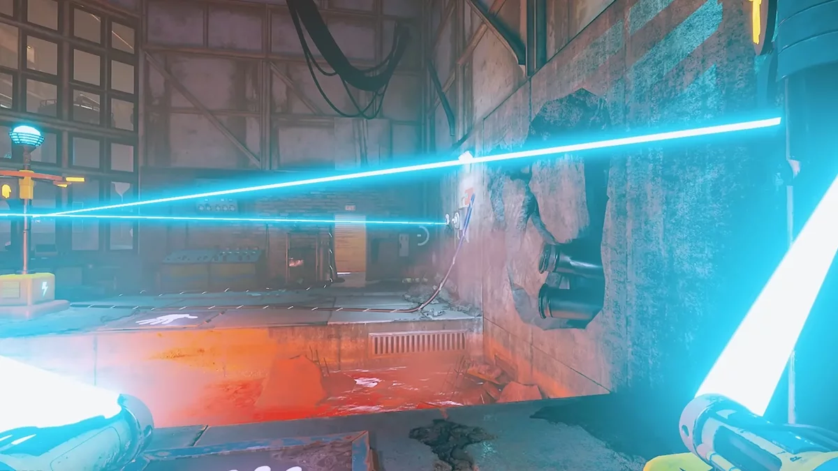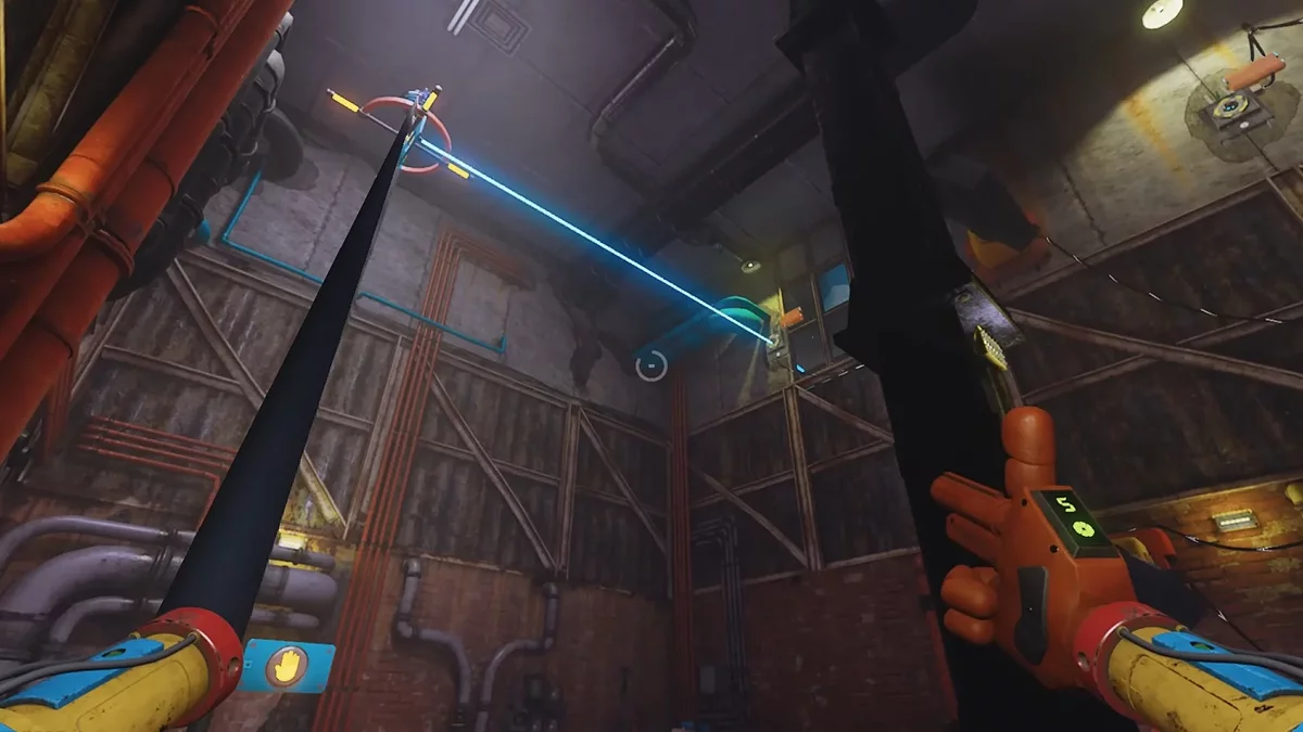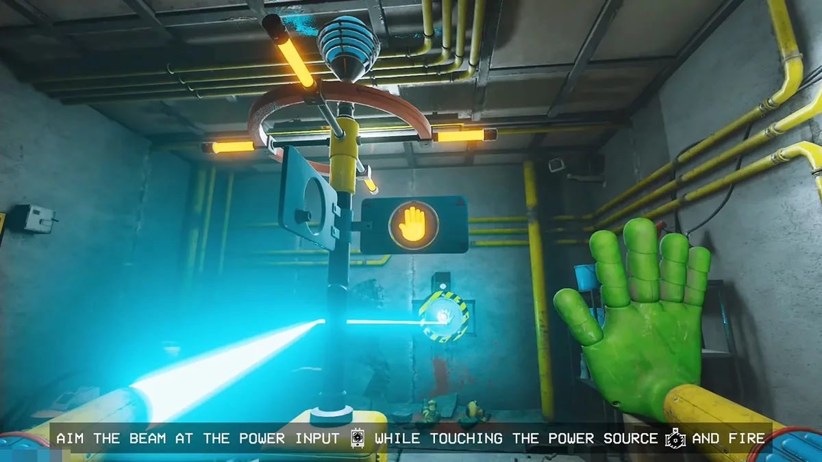 Поверните дальнюю стойку, чтобы луч был направлен на розетку. Вторая же стойка должна смотреть в сторону первой. Подпрыгните на батуте и взаимодействуйте с источником питания, затем направьте вторую руку во вторую стойку.