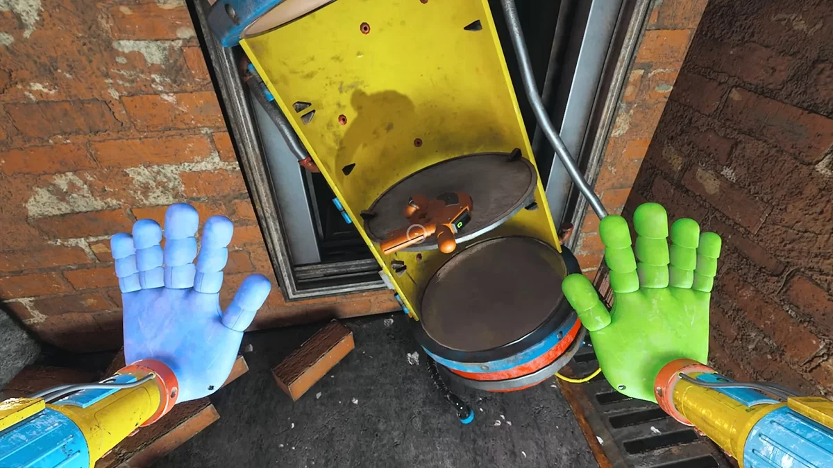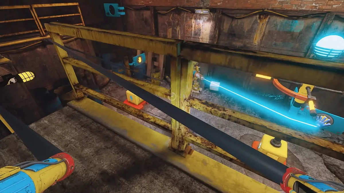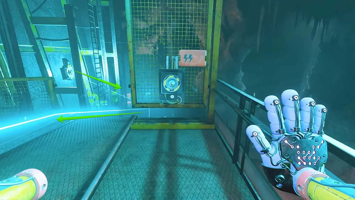 Так появится возможность использовать батуты и забраться выше. Здесь опустите рубильник — откроется доступ к лифту. Также захватите двумя руками батарею в колбе и сбросьте вниз (можете упасть вместе с ней).