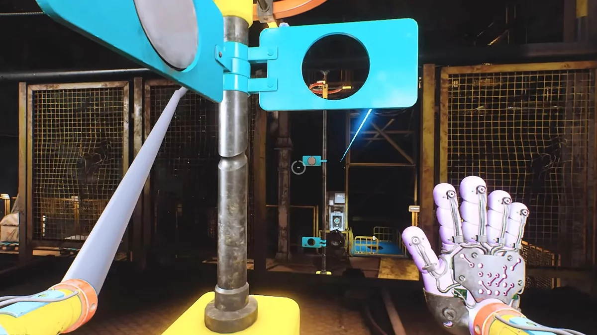 Следуйте к стационарной механической руке и разверните колонну здесь к следующей стойке. Проделайте эти же действия со следующими колоннами — последняя должна смотреть в отверстие в стене справа.