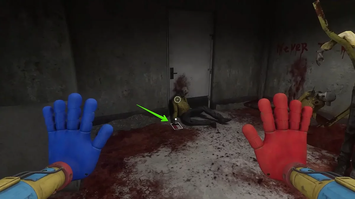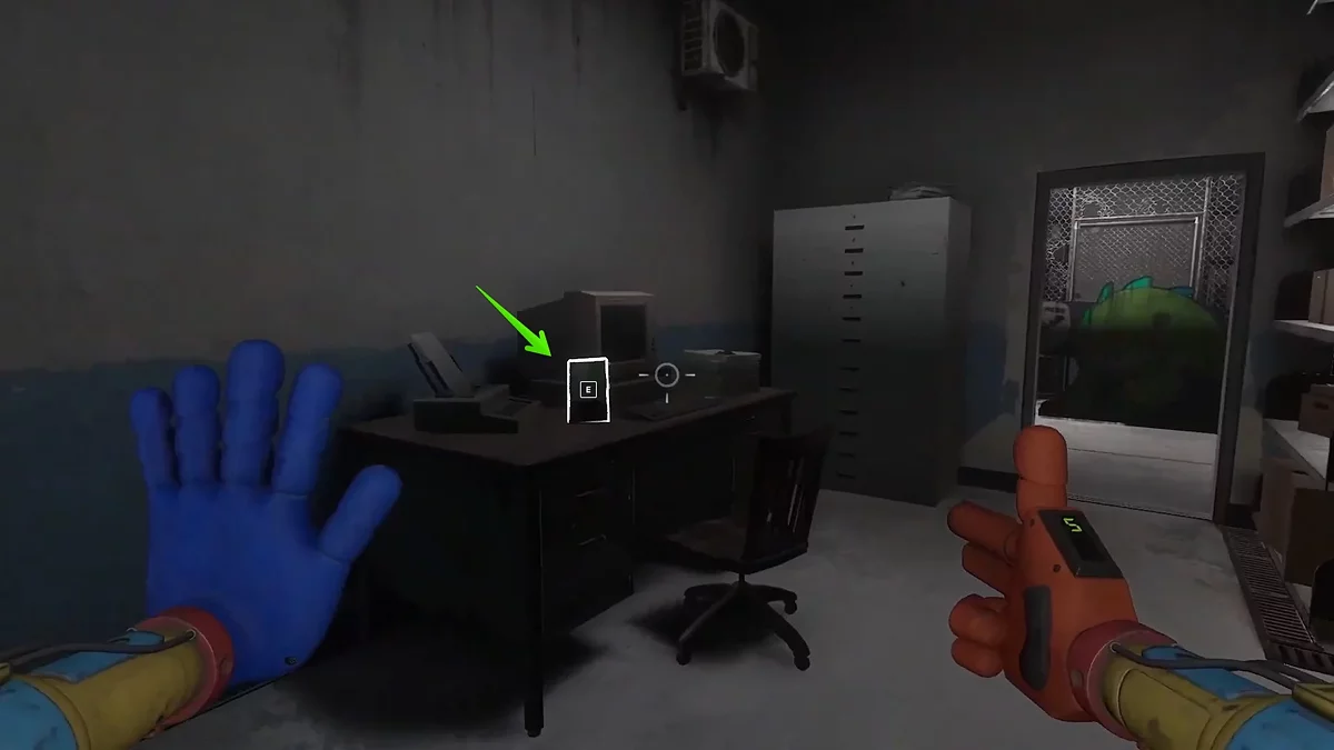 Если пройти по крайнему правому коридору, найдёте заметку на выдвижном ящике. В центральной же комнате на стеллаже спрятана видеокассета. Когда будете готовы, примените зелёную ключ-карту на считывателе карт у желтой двери, затем спрыгивайте вниз к монстру.