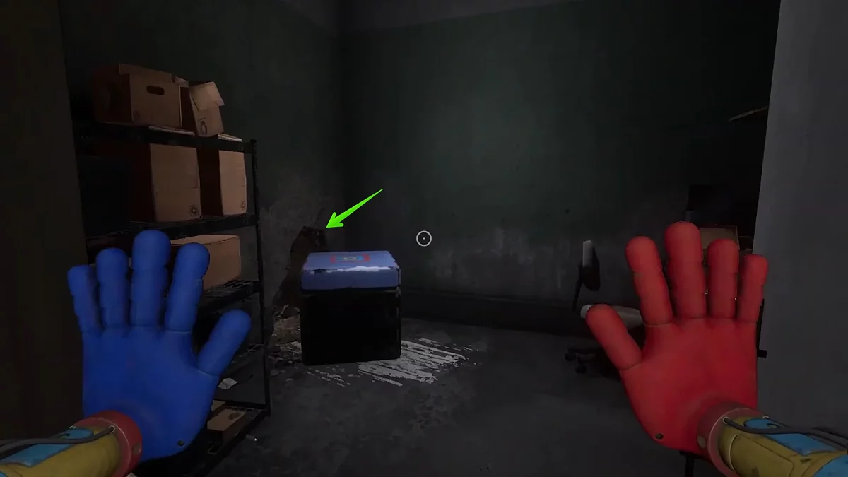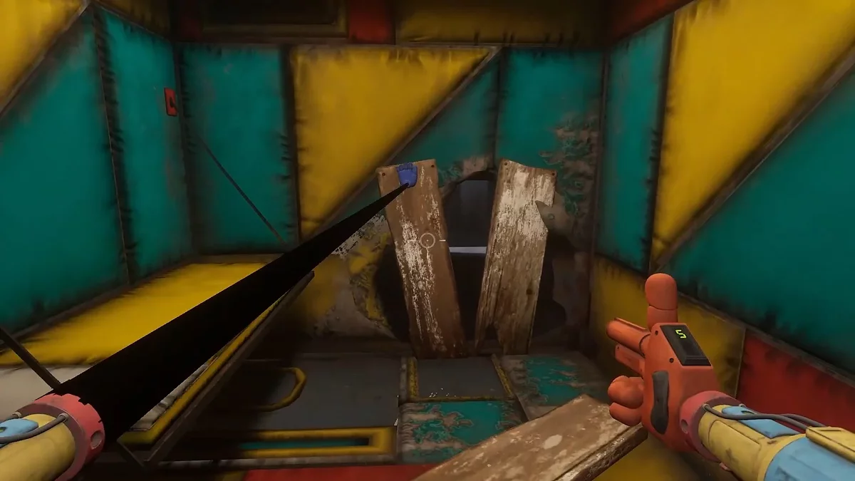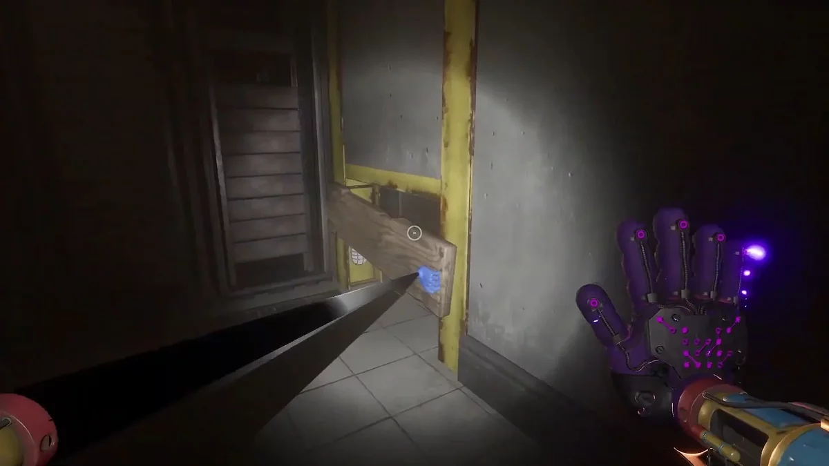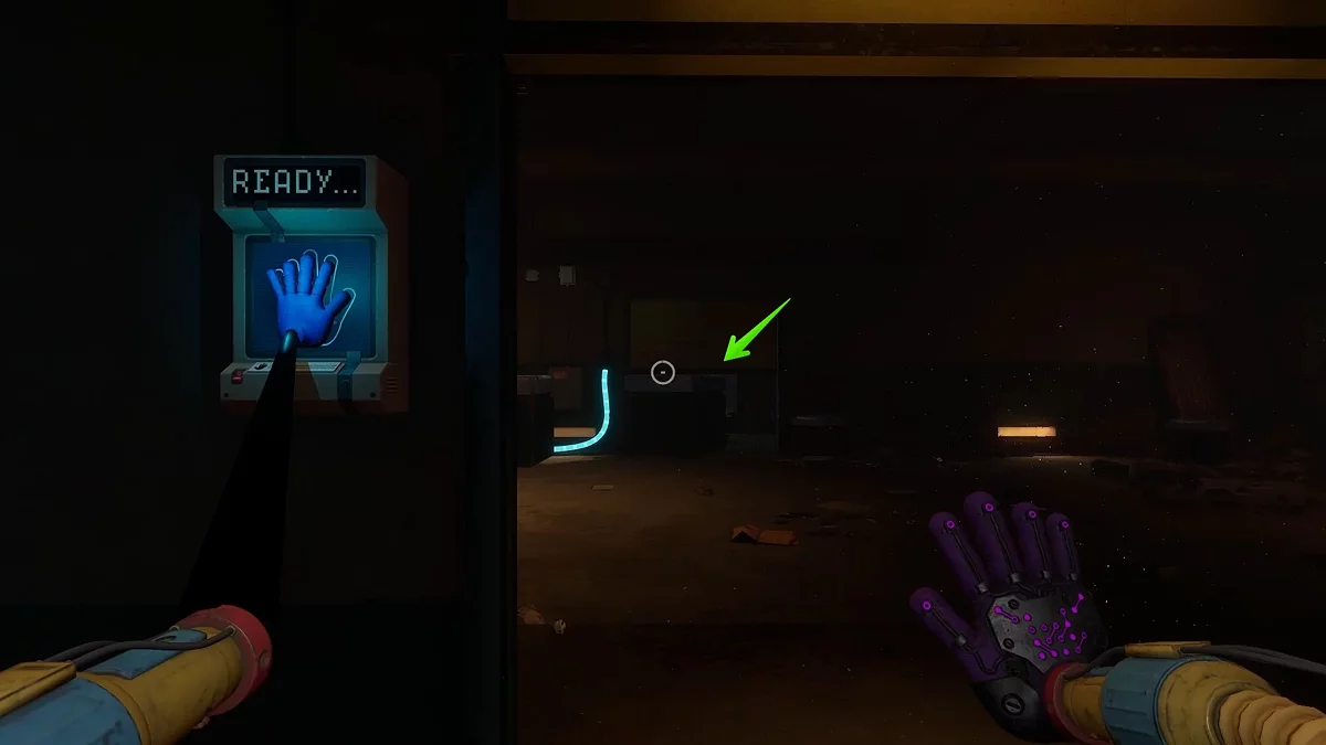 В конце коридора вы увидите сканер красной перчатки, но такой сейчас нет на данный момент. Бегите в обратную сторону и откройте дверь в контейнер на противоположной стороне. Здесь есть заколоченный досками проход — избавьтесь от них при помощи перчатки. Предварительно откройте дверь в соседнюю камеру: сканер синей перчатки виднеется через завал.