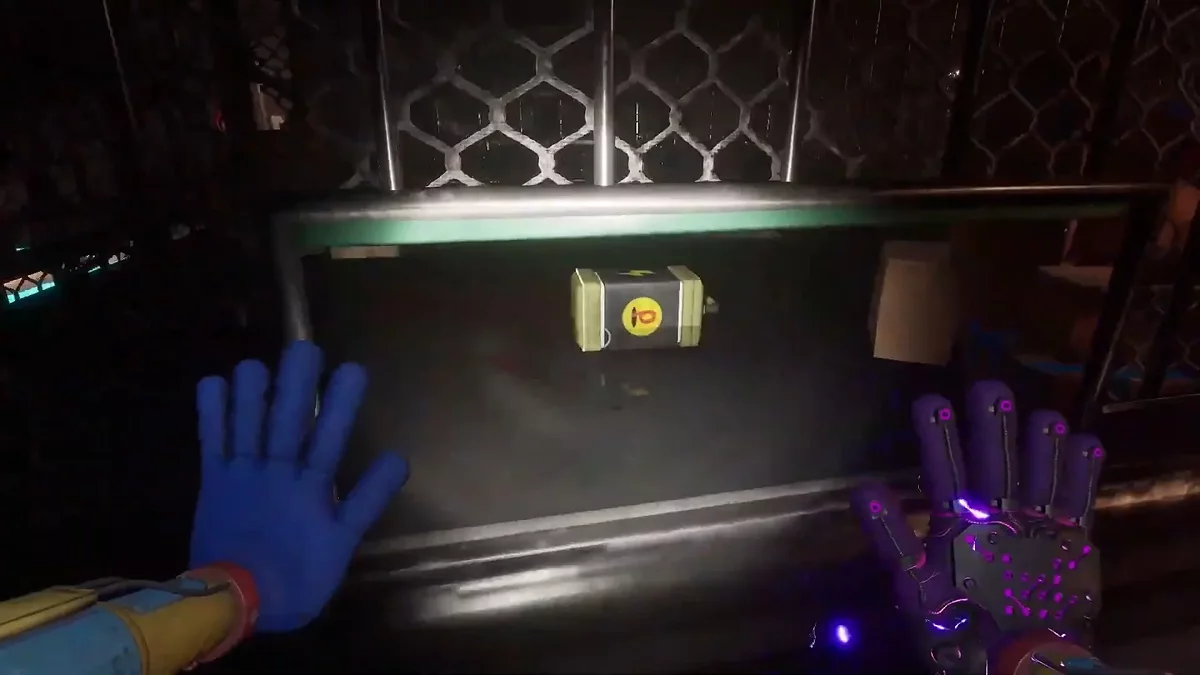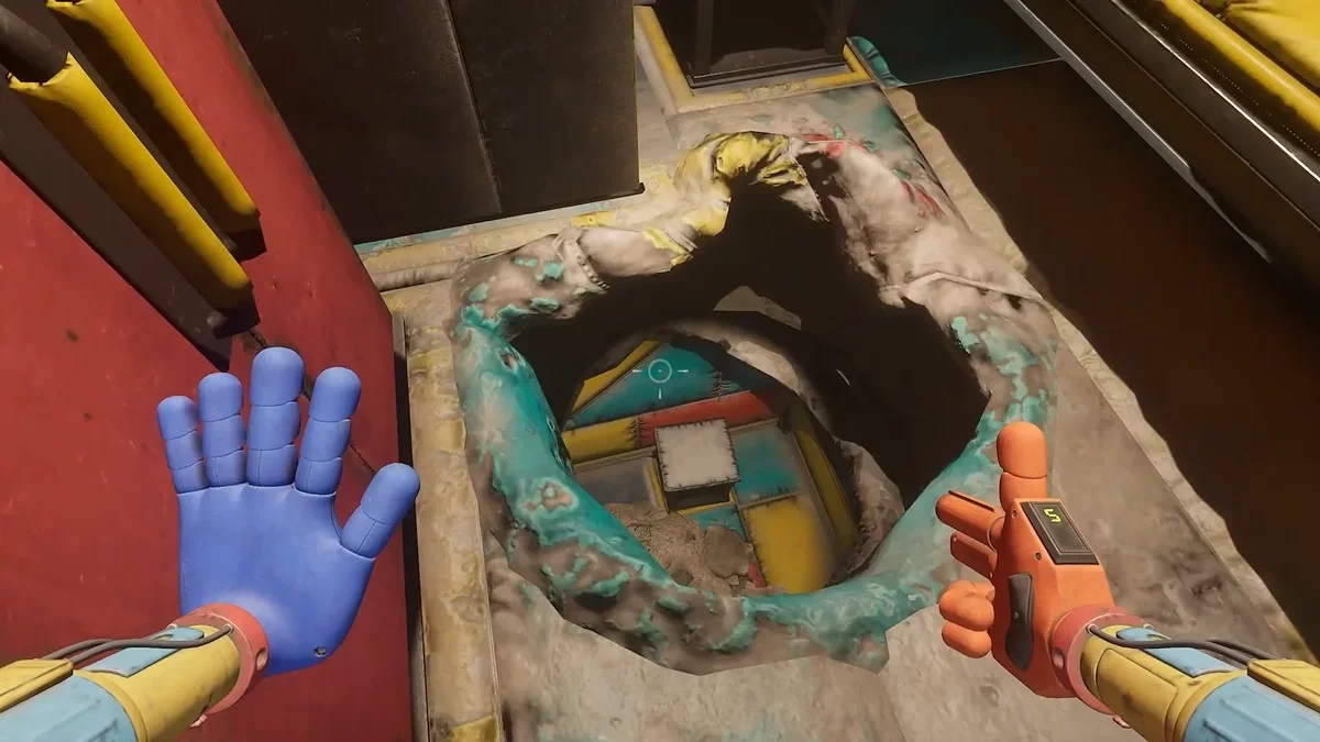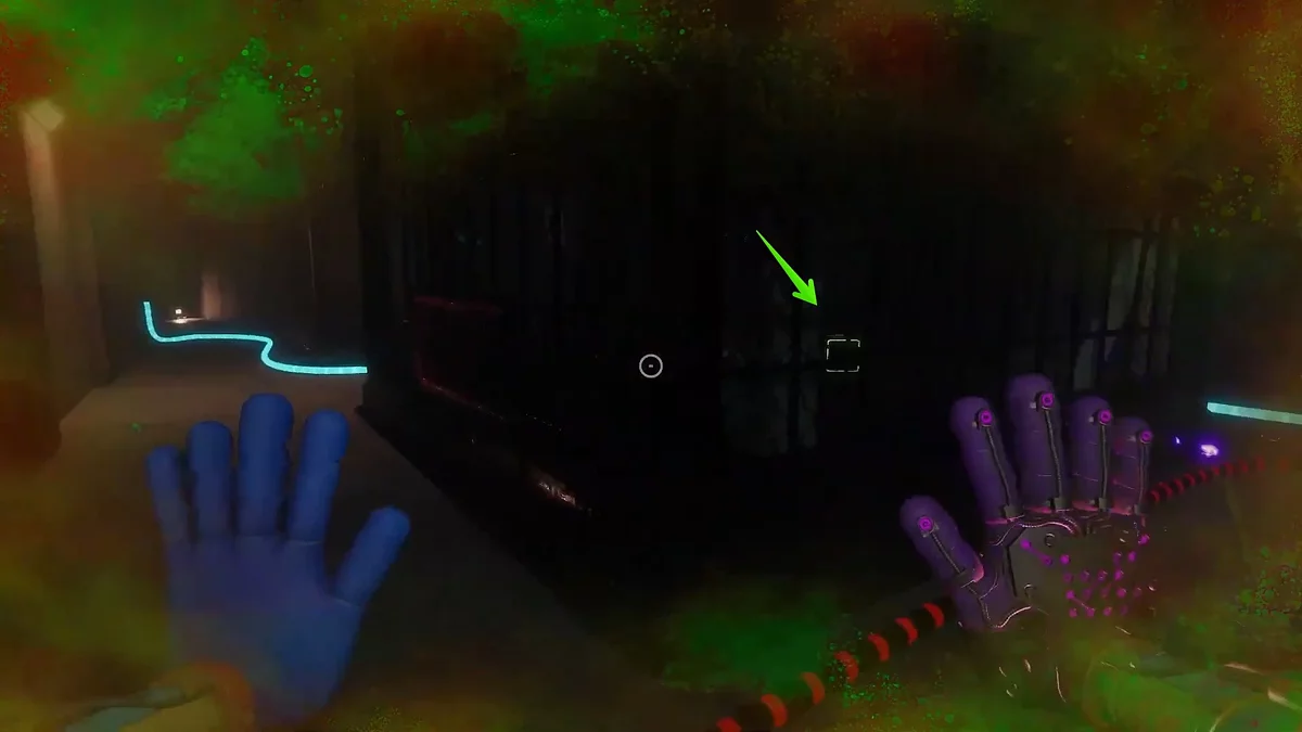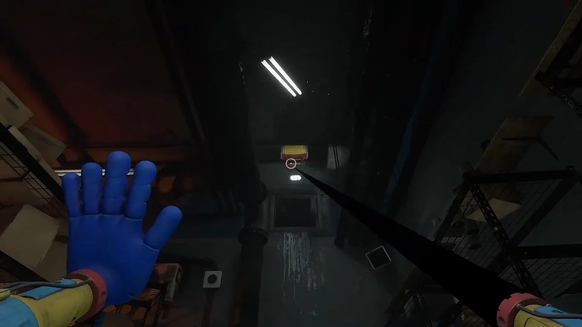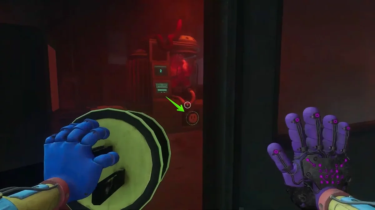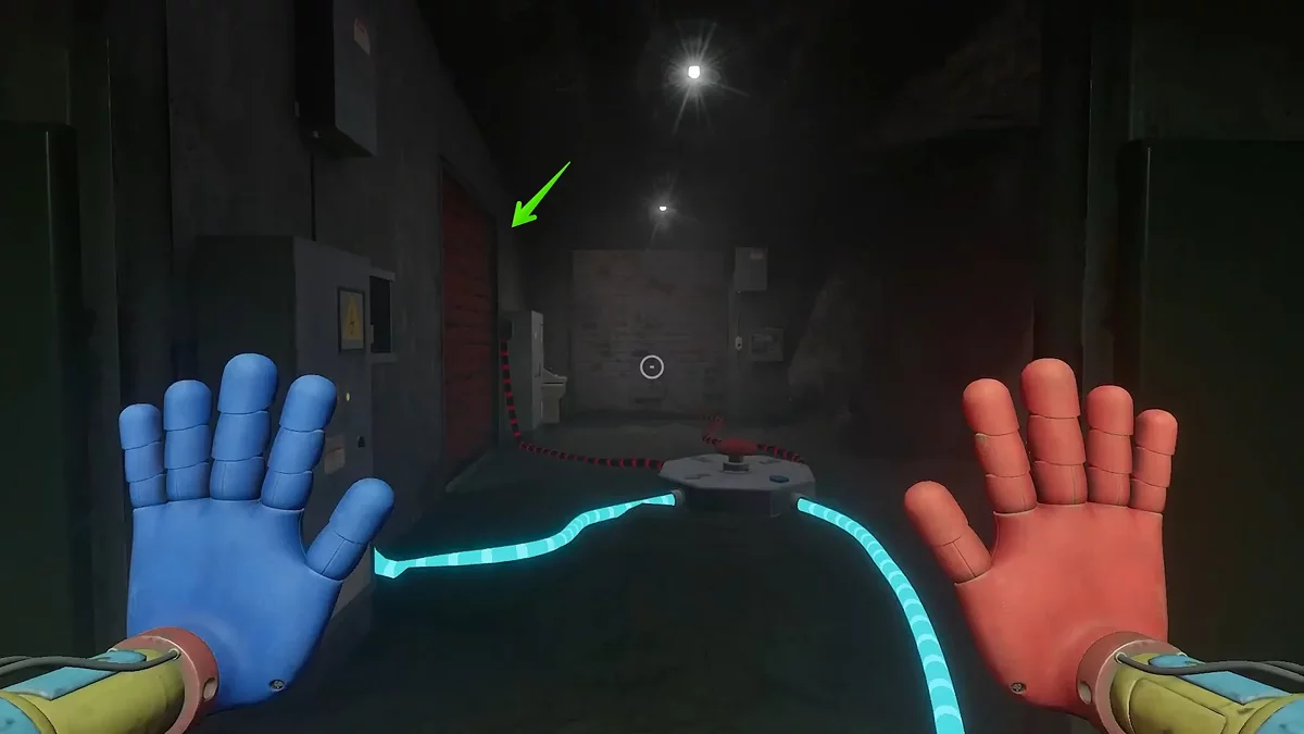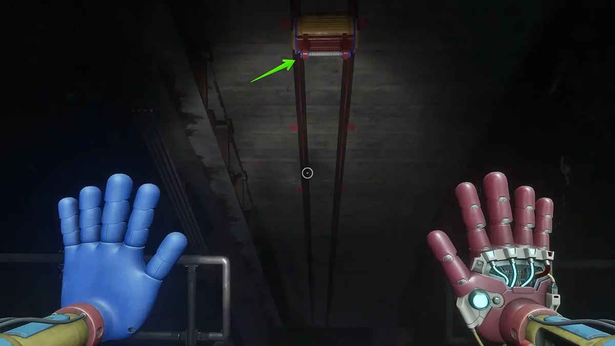 Когда поезд остановится, поднимитесь наверх при помощи зацепа и пройдите по вентиляционной шахте. Откройте дверь синей перчаткой и вернитесь назад. Закройте дверь в камеру с игрушками, а соседнюю дверь слева, наоборот, откройте и спрыгивайте в отверстие в полу.