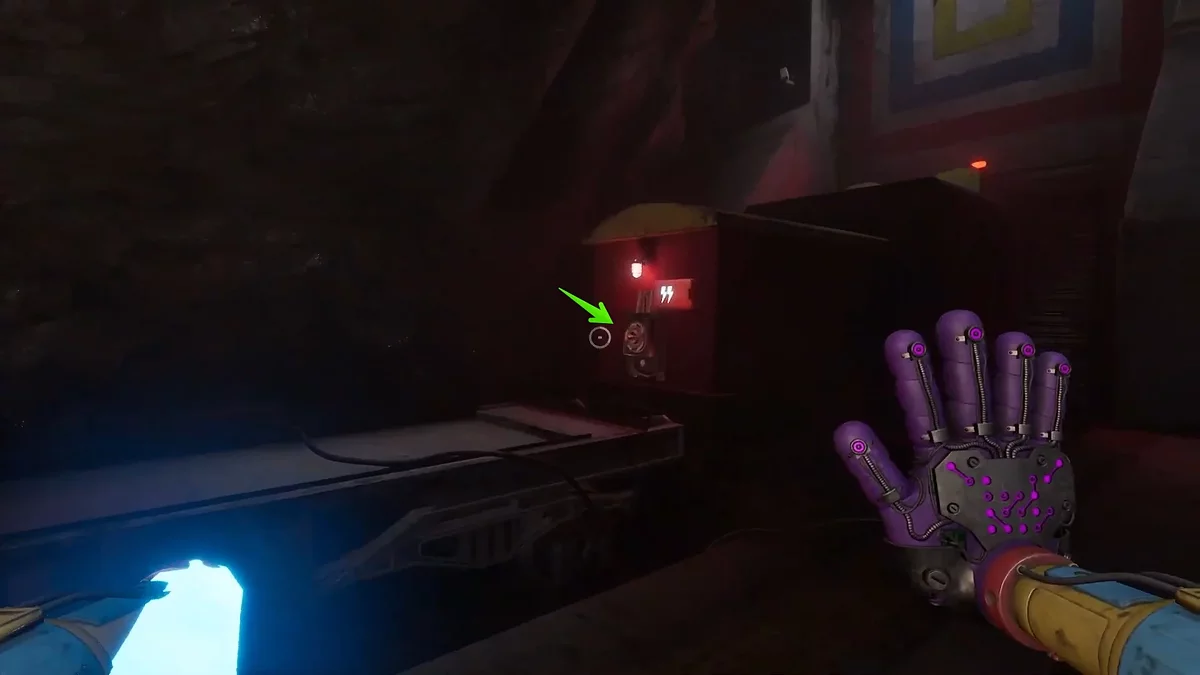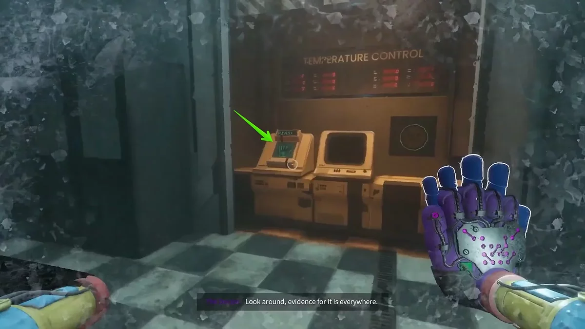 Откройте холодильник №2, заберите батарею и вставьте её в циркулярную пилу. Передвиньте инструмент, чтобы обрезать кабель и получить синюю перчатку. Прикрепите её к своей правой руке, затем используйте на сканере у терминала.
