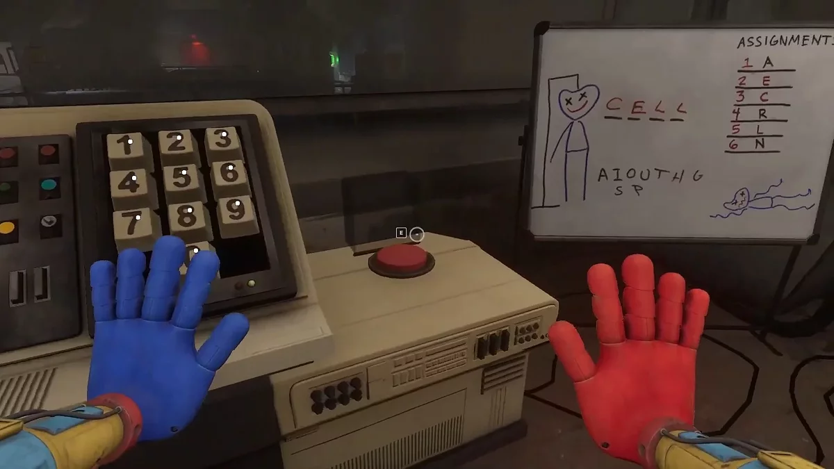 Из предыдущей комнаты следуйте по красному кабелю и отыщите колбу с игрушкой, на бирке которой написан код. Вернитесь назад и найдите на полу синий кабель — он приведёт ко второй игрушке. С каждой найденной игрушкой на мониторах в центральной комнате будут появляться числа, из которых можно будет составить код.