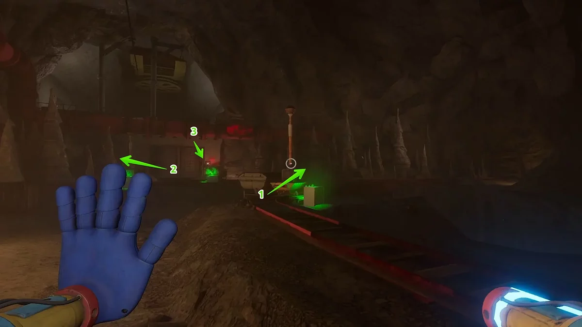 Ваша задача в этой области передвинуть вагонетки так, чтобы все красные лампочки светились зелёными. Для этого пройдите в тупик и подвиньте вагонетку в левую часть. Это откроет доступ к платформам с энергостойками. Передвиньте их вперёд. Вернитесь назад к палаткам и захватите источник питания перчаткой, обведите между двумя колоннами и направьте вторую перчатку на розетку.