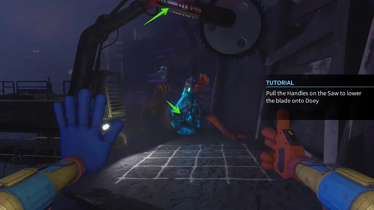 Рекомендуем подготовить ракетницу перед побегом, так как на вас будут набрасываться мелкие игрушки. Спрыгивайте на конвейер и бегите в левую сторону. В тупике вы отыщите лифт — вызовите его с кнопки. На верхнем уровне шахты вы встретите Доуи.
