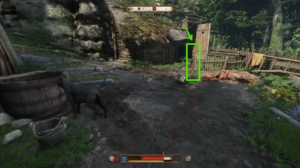 Перед тем как снова обратиться к Божене, отведайте похлебки из котелка и выходите на улицу. Слева стоит ушат с водой, однако мы рекомендуем сперва осмотреть труп разбойника во дворе. Вы можете одолжить его вещи, которые, к слову, окровавлены. Когда сделаете это и наденете новую экипировку, умойтесь в ушате. Кровь будет смыта не только с тела, но и с одежды. В дальнейшем вы можете использовать этот совет и с другой экипировкой.