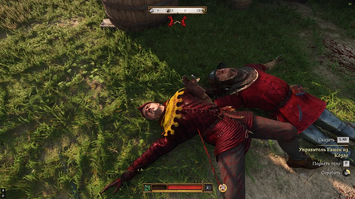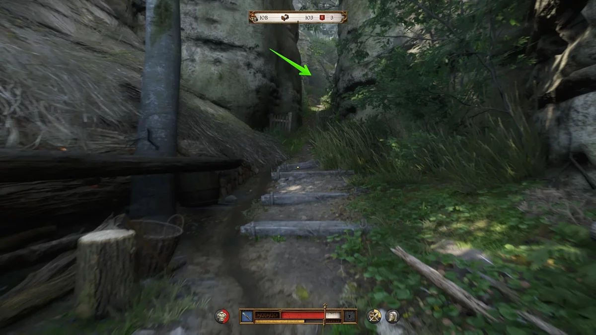 На обратном пути, как только вы подойдёте к дому бабушки, увидите двух разбойников. Экипируйте мясницкий нож и быстро убейте одного из них. Второй противник вскоре сбежит, а вам снова придётся отправиться к ручью, чтобы похоронить тело. Предварительно не забудьте обыскать бедолагу и получить некоторые припасы, а также связку ключей.