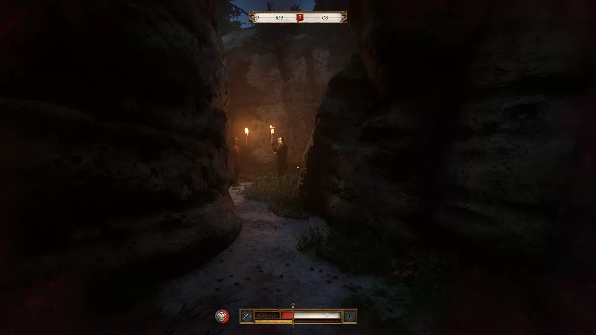 Пройдя ещё немного вперёд вы заметите, что спутника нет поблизости. Если вернуться назад, увидите двух солдат с факелами — идти в эту сторону не стоит. Продолжите путь по тропе, пока не увидите небольшую скалу, разделяющие две тропинки. Вам нужно обойти эту скалу и двигаться все время по дороге. Справа в кустах будет ждать приятель.