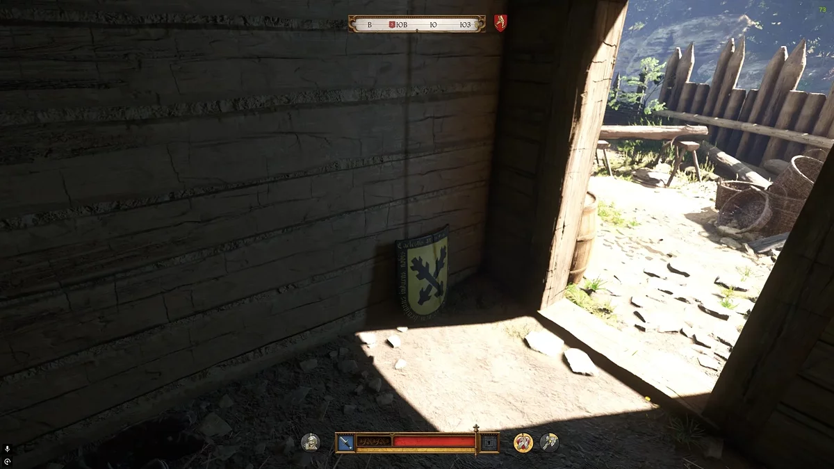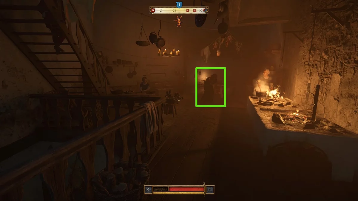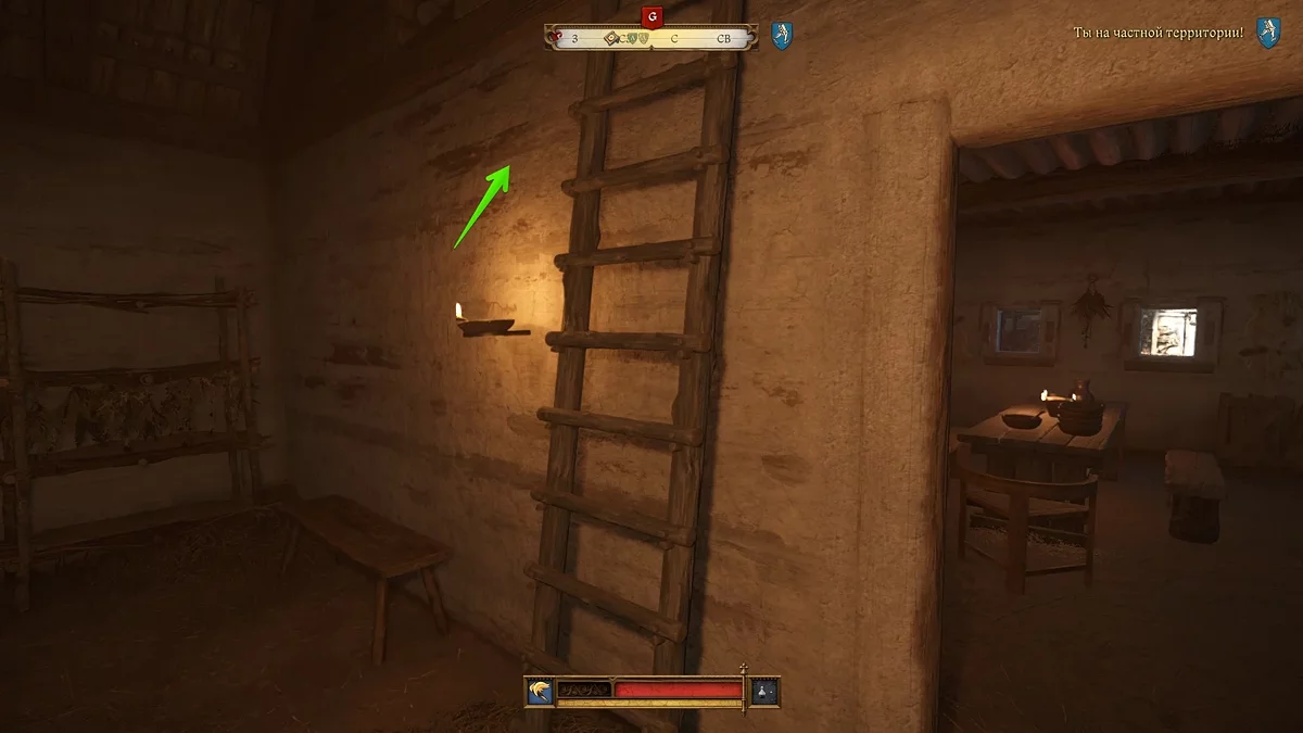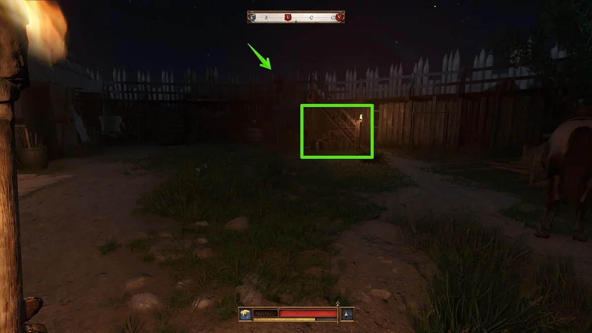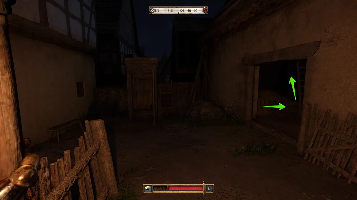 Отправляйтесь в восточную часть поселения и доберитесь до заднего входа во двор корчмы. Здесь будет небольшой амбар с несколькими стражниками — один сидит у костра, другой патрулирует территорию. Вам даже необязательно разбираться с ними, поскольку вы можете забраться по лестнице в амбар.