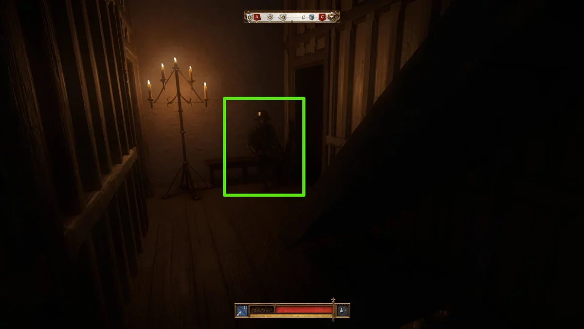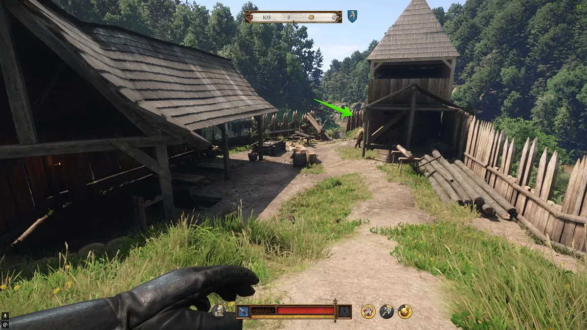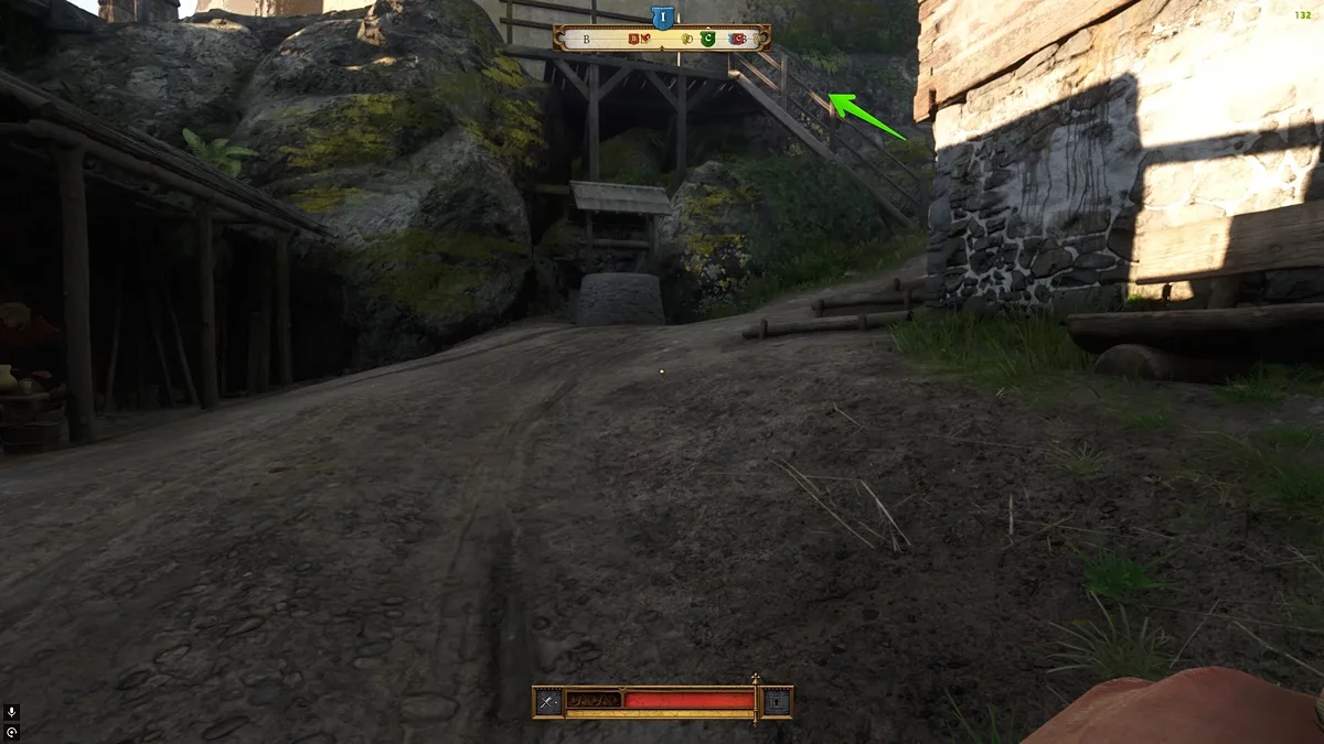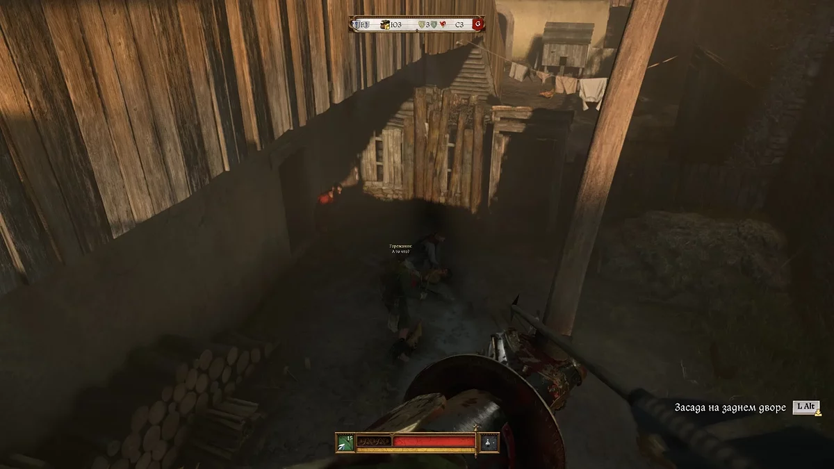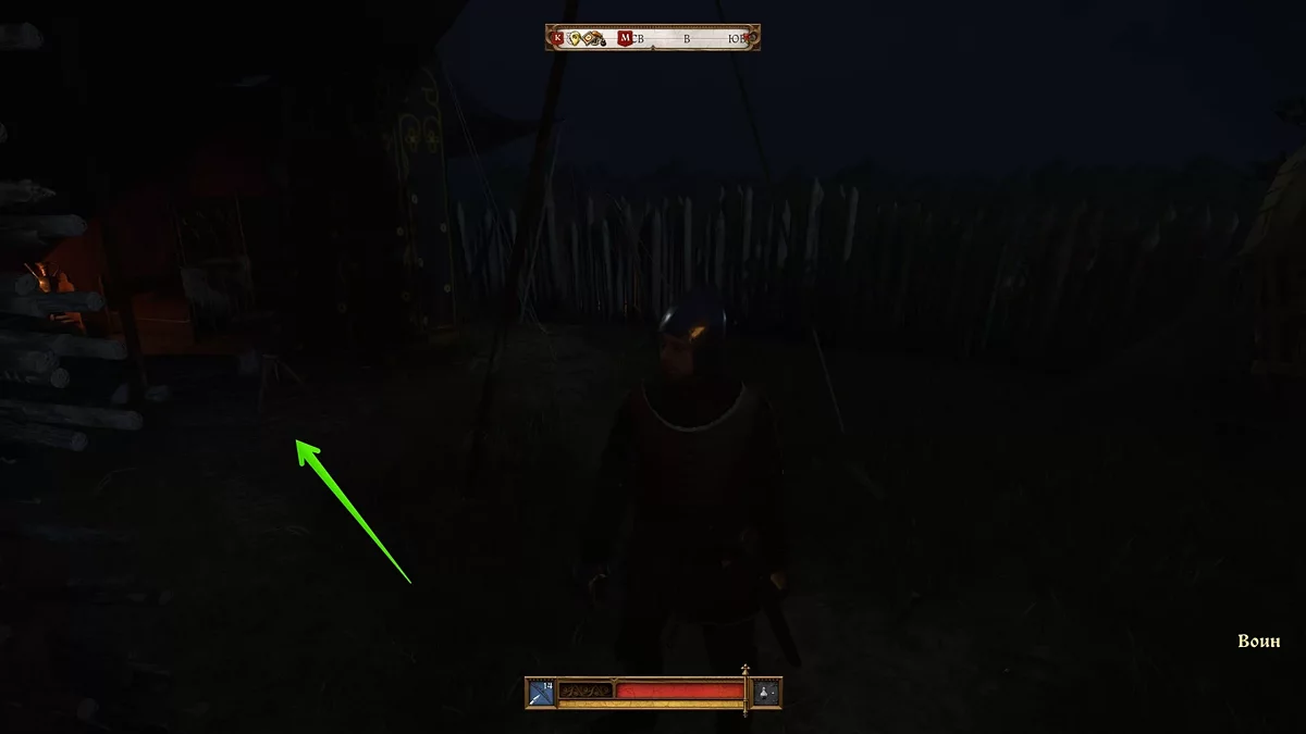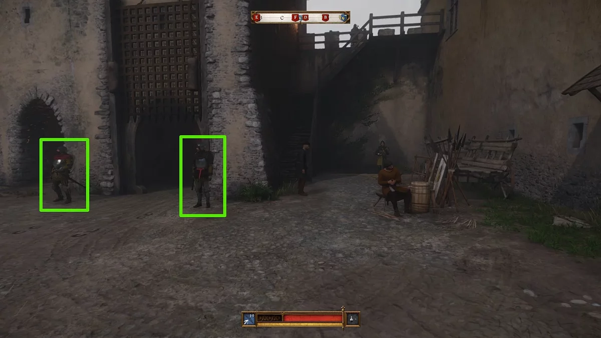 Вам нужно выйти из этого двора, повернуть налево и войти в ближайший двор. Здесь также будет патрулировать один враг. Вы, конечно, можете убить его стрелой в голову, так как он не использует шлем, однако это обязательно привлечёт внимание врагов поблизости — они сбегутся на крики. Рекомендуем бросить Шмуэля за палаткой, убить патрульного, спрятать его труп и затем пройти с приятелем в этот двор.
