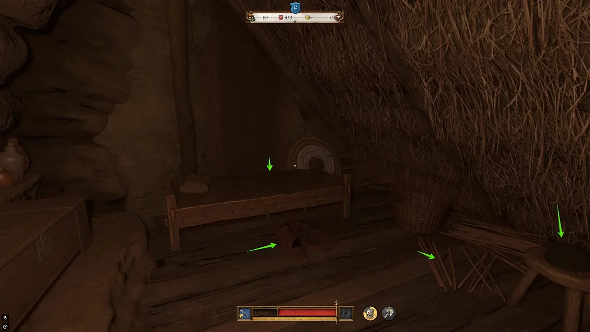 Поднимитесь на второй этаж и осмотритесь. На полу изучите брошенные вещи, недоделанную работу, неубранную постель, а также подберите мужскую шапку на табурете рядом с лестницей.