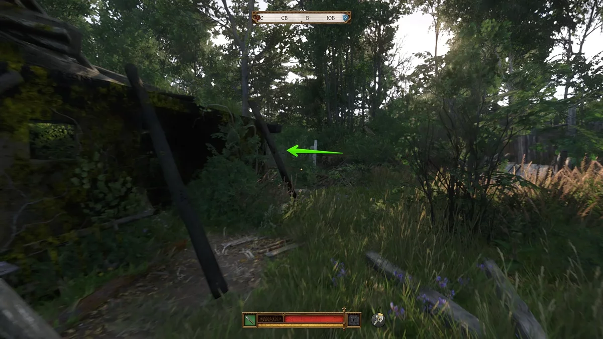Спешившись, пройдите по дороге немного назад и отыщите развалины хутора в лесной чаще. Подготовьте оружие, так как на территории бродит волк. Убейте животное и осмотрите здание. Замок на двери самой высокой сложности, но вы можете обойти дом и забраться внутрь через окно.