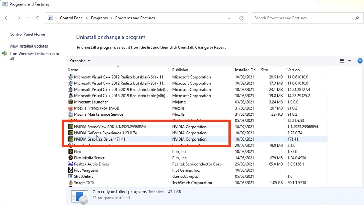 Запустите «Панель управления» и выберите подраздел «Удаление программ» в соответствующей вкладке. Найдите среди перечня всех приложений несколько пунктов, относящиеся к видеокарте, и поочередно сотрите.