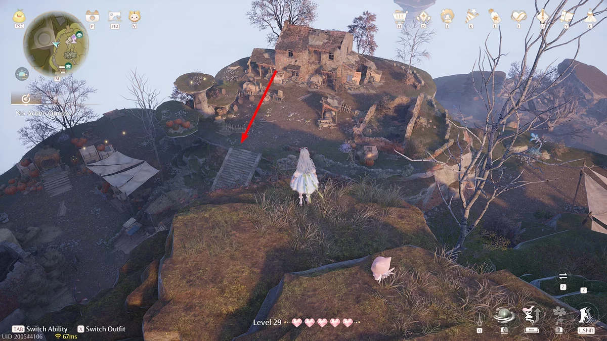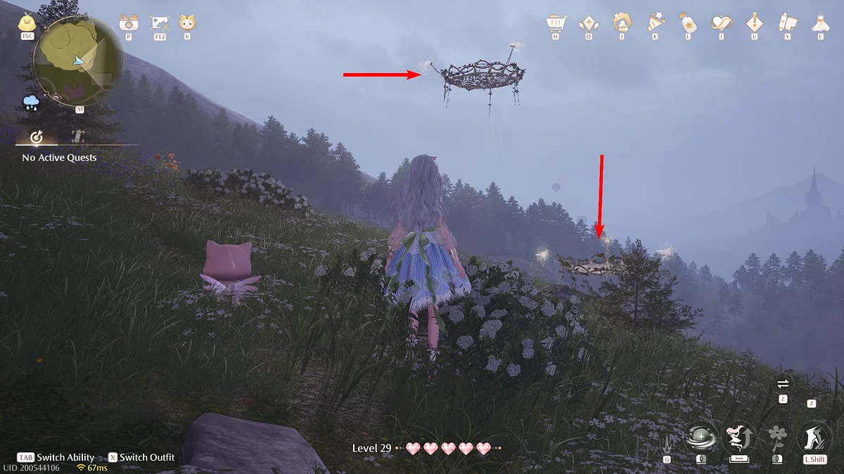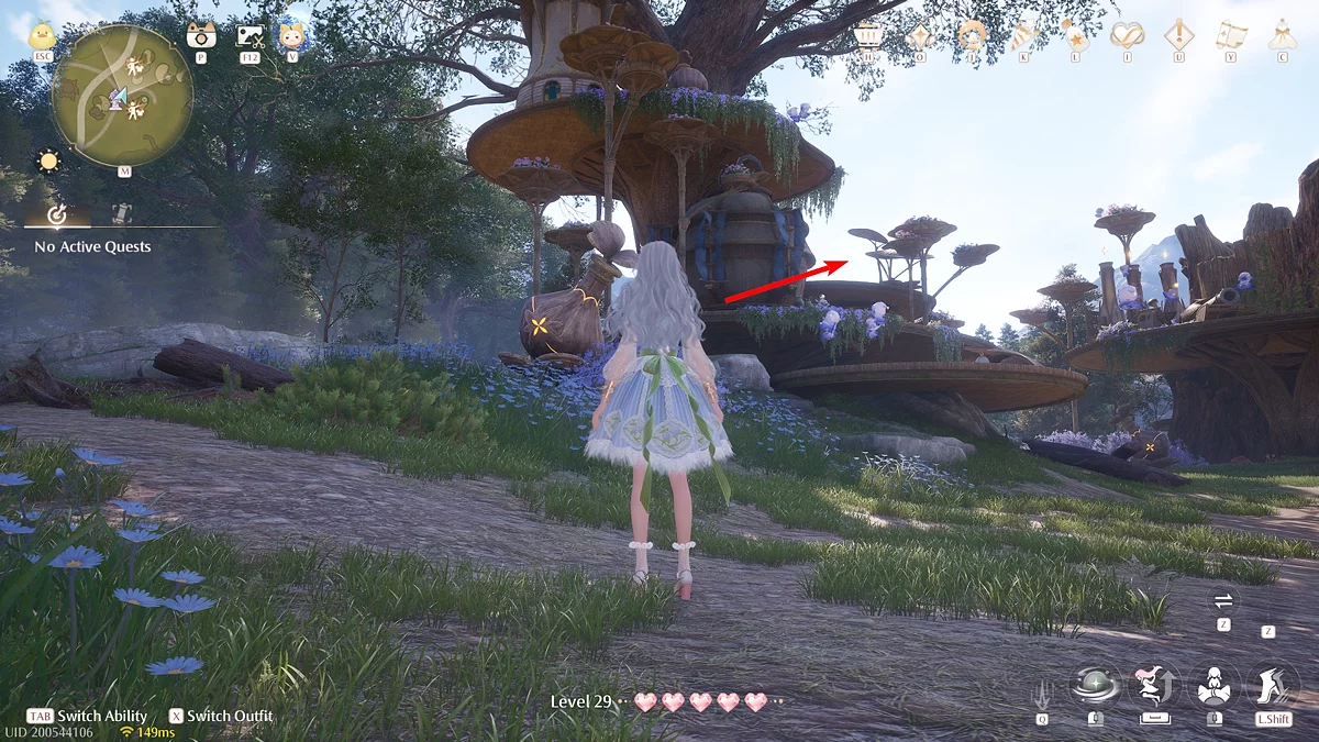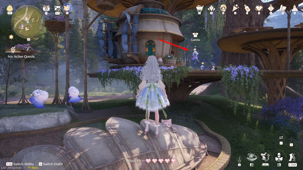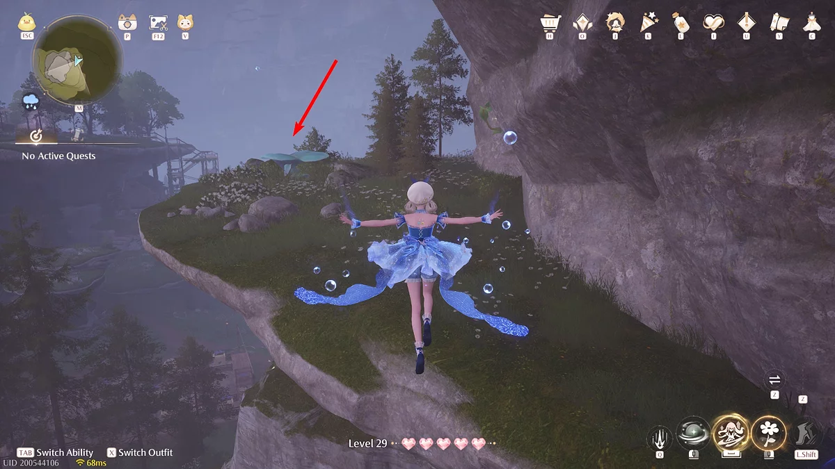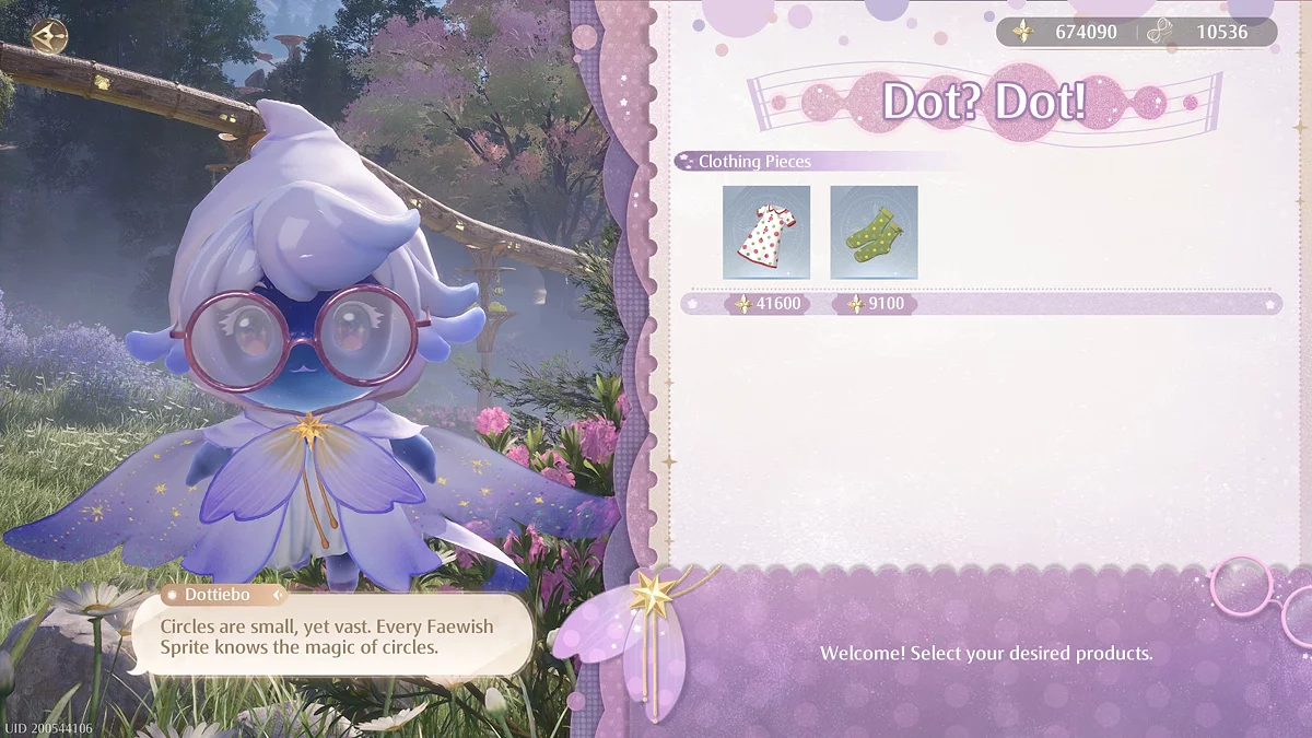 Затем перепрыгните через другие уровни по кругу, перейдите на более высокую платформу по упавшему стволу дерева и наконец заберитесь на самый верх с помощью батутов-сеток. Там вы встретите продавца по имени Кокетливая Фея и поговорив с ней, откроете доступ к ассортименту. Фея также продаёт две вещи: блузку лавандового цвета и босоножки за блинги.
