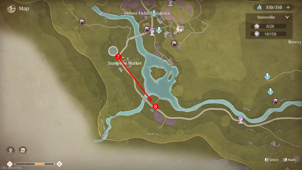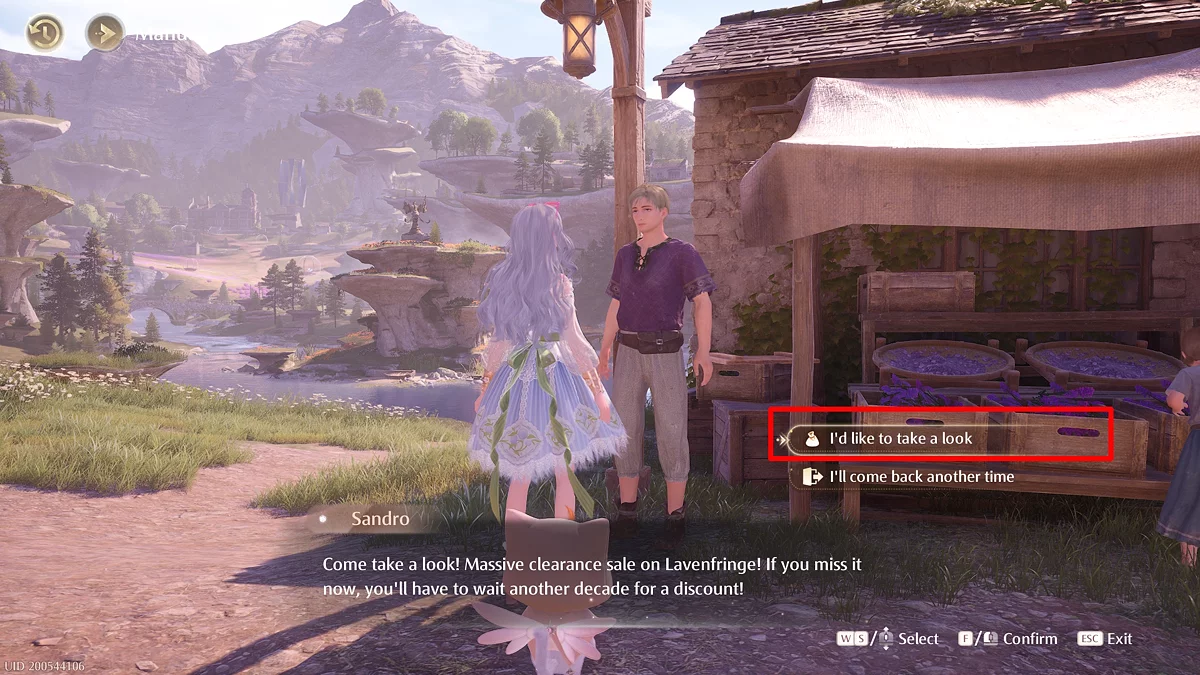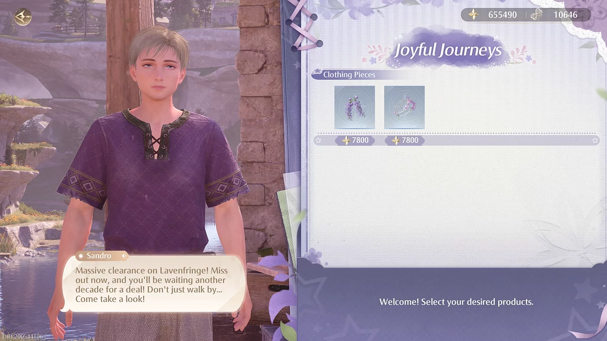 Продолжайте идти по широкой дороге на юг от голубого шатра. Пересеките мост через реку и поверните налево. Сразу около небольшого дома, стоящего на берегу реки, увидите мужчину по имени Сандро со светлыми волосами. Поговорите с ним, чтобы просмотреть ассортимент бутика. В магазине вы можете приобрести симпатичные аксессуары лавандового цвета для своих образов: серёжки и браслет. Стоят они относительно недорого — по 7000 блингов.