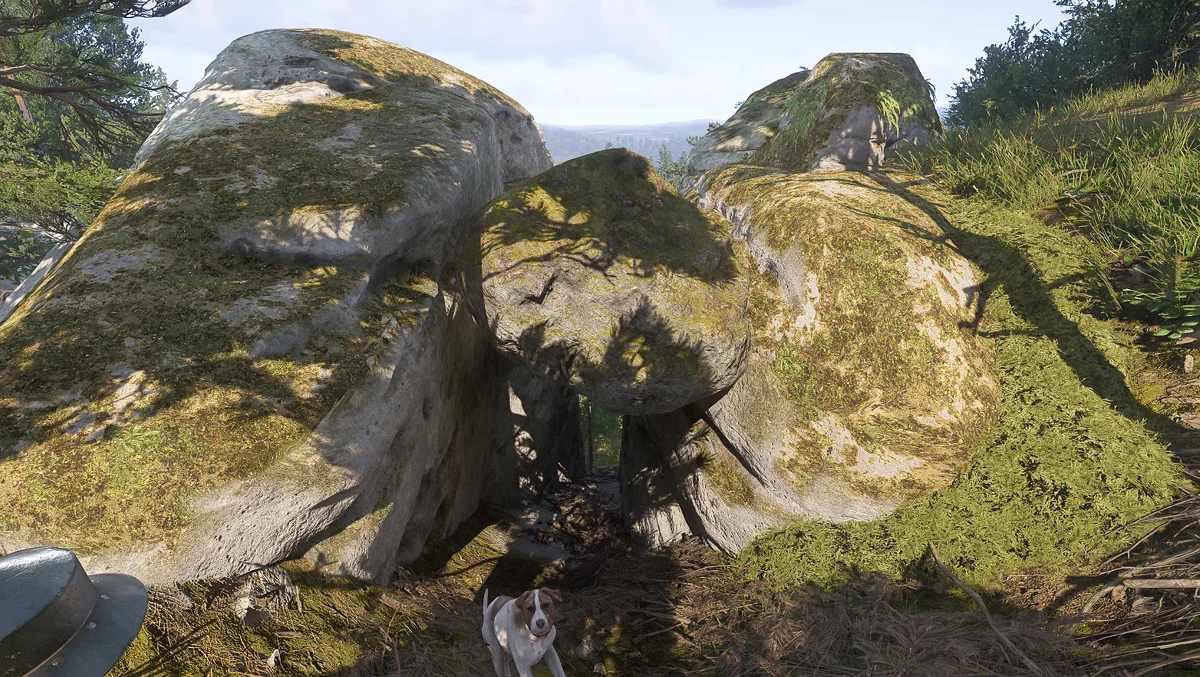 От места быстрого перемещения у замка Трокси поверните направо и идите в сторону Аполена. Следуйте через сад с травами до места, указанного на карте как «Развалины в скалах». Там вы увидите описываемый ранее Баженой камень, застрявший между двух скал — это знак того, что вы почти на месте. Если последуете нашим советам, вы, скорее всего, не встретите противников. Добравшись до места, попросите вашего пса понюхать платок Марики.