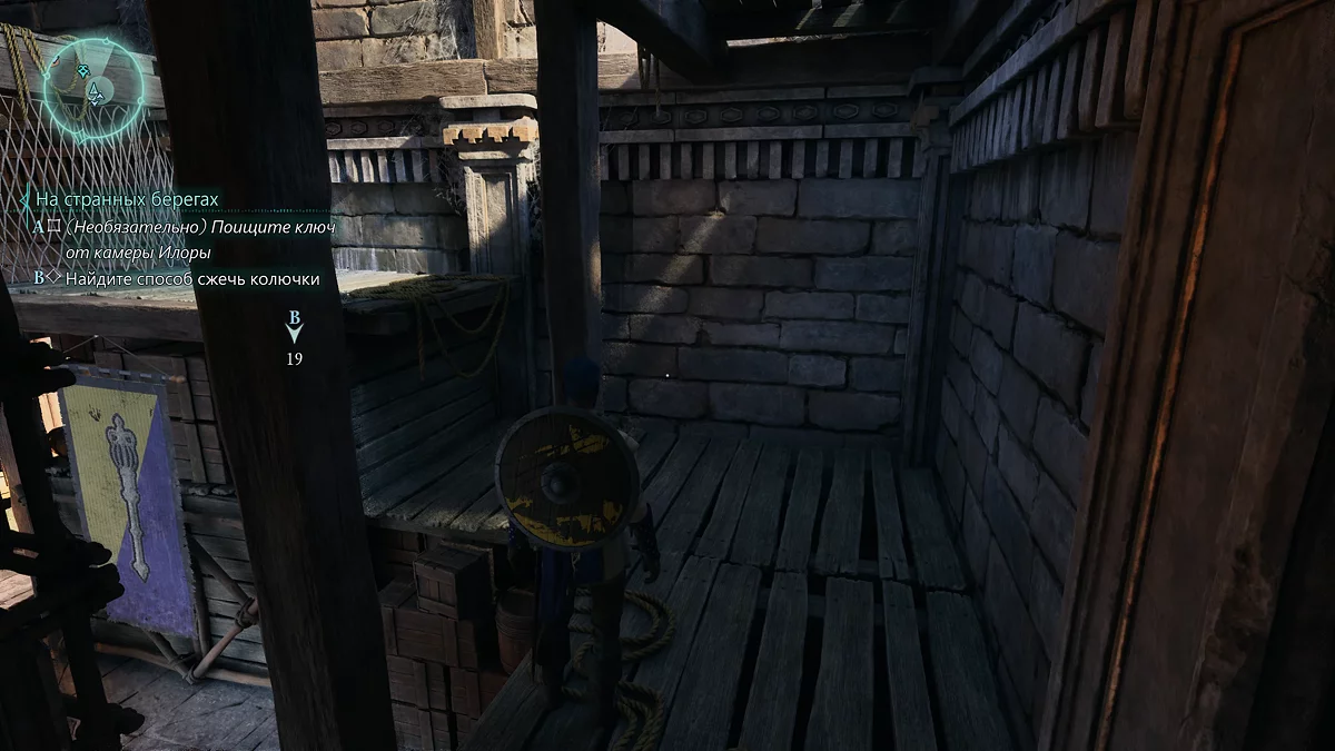 По ящикам и деревянным настилам заберитесь на верхний этаж и пройдите в пролом. Справа лежит тело солдата с зельем, а слева на платформе можно найти лук. Выстрелите из него в растение над наростами, преграждающими путь. Так вы сможете пройти дальше. Илору можно не освобождать, однако мы рекомендуем сделать это. Вернитесь к трупу с зельем и разбейте деревянный пол. В комнате подберите ключ от камеры, а также обычную мантию.