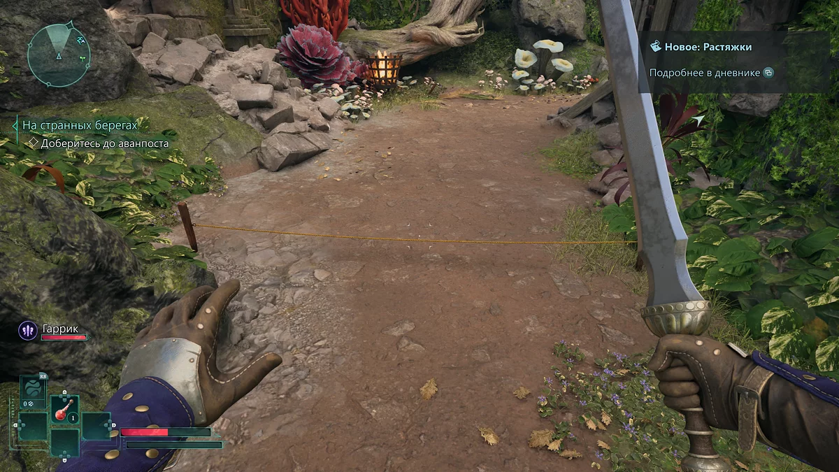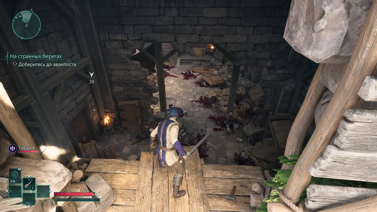 После кораблекрушения поговорите с Гарриком об инциденте. Обсудите с ним атаку на судно, после чего новый подчиненный предложит продвигаться вперед. Для начала вам нужно подобрать меч и зелье лечения. Идите к доскам впереди и разбейте их мечом. Забравшись по уступам, проберитесь под скалой.