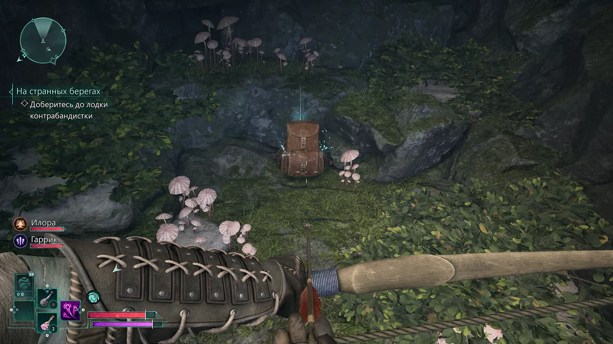 Впереди вы найдете мертвого мага. С него можно подобрать гримуар с заклинаниями, волшебную палочку и зелье ауры — местной маны. Заклинанием из книги сожгите наросты, преграждающие путь. За ними еще одна группа врагов. В пещере правее будет рюкзак с припасами. Вам же нужно вперед. Подберите в главном проходе справа зелье лечения и прыгайте в воду.