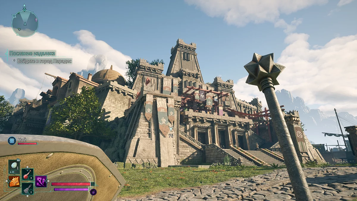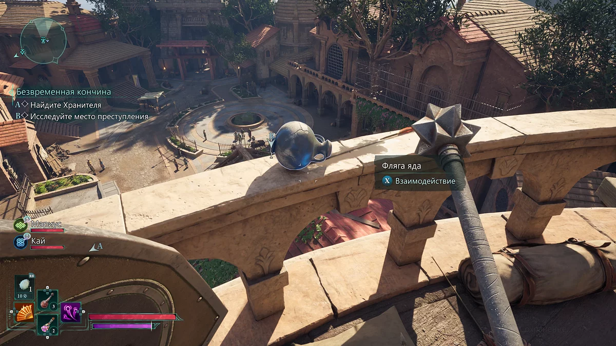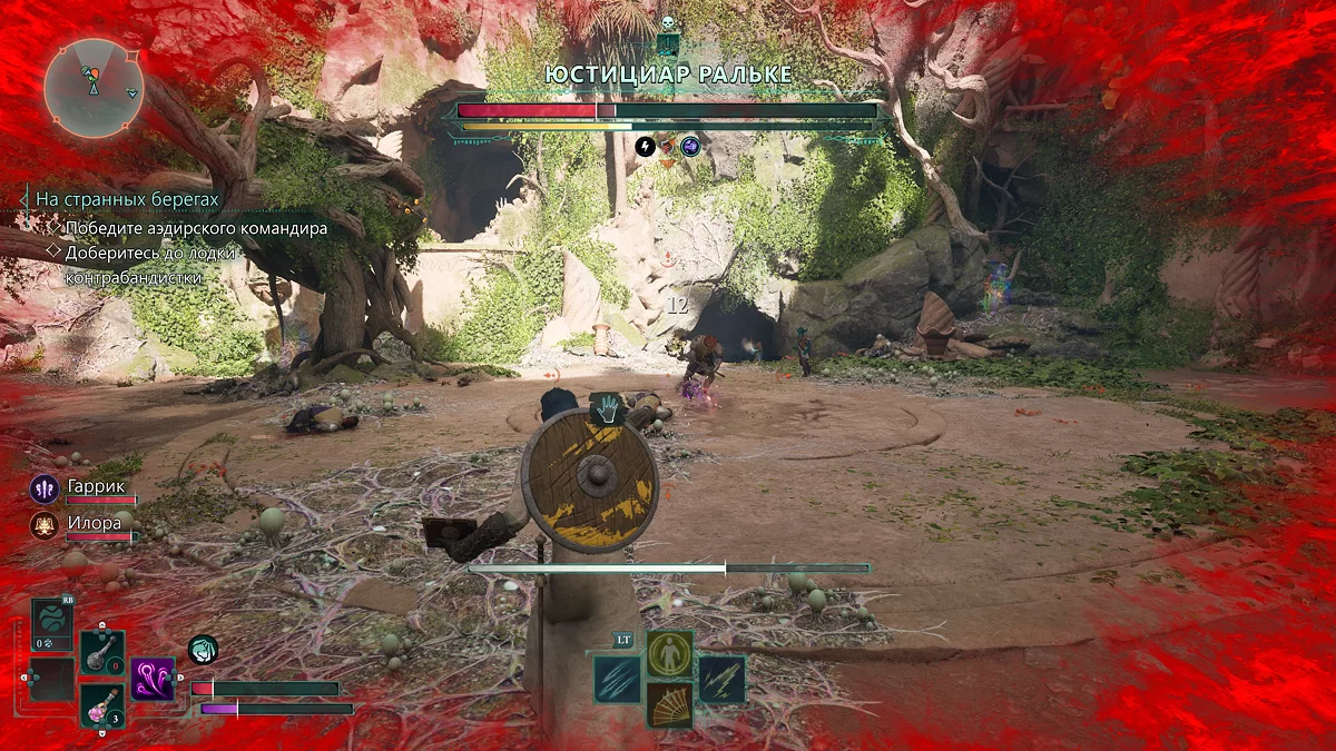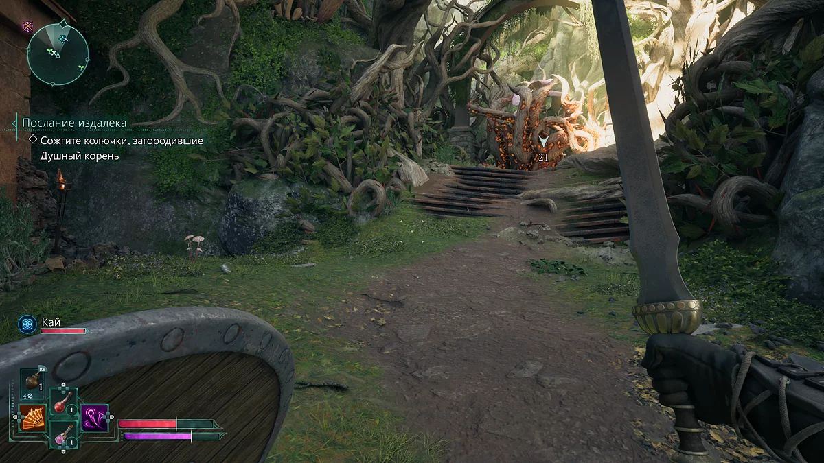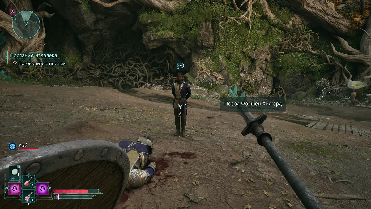 Бой с ним мало отличается от рядового столкновения. Главное не забывайте использовать способности Кая, так как без них компаньон практически бесполезен. После победы осмотрите тело одного из солдат и заберите щит «Непоколебимый долг». Если пройдете по кровавому следу, подберете булаву. Пообщайтесь с послом, а затем со странным голосом в кристалле рядом. Голос предложит сделку. Видимо от вашего ответа зависит способность, которую получит герой. Впрочем, применять их постоянно не выйдет. Мы на сделку согласились, после чего герой получит возможность очищать территорию от болезни и лишних отростков.