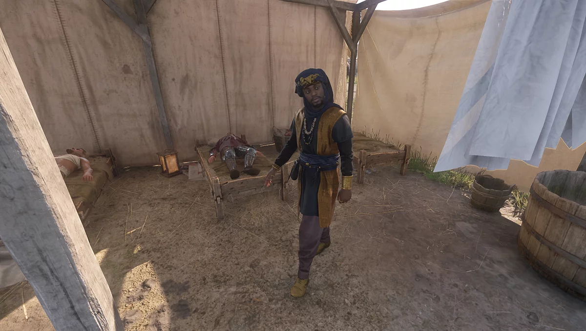 Найдите полевой госпиталь, который расположен слева от входа в главный шатер лагеря. Там вам нужно будет поговорить с лекарем Мусой из Мали. Расспросите его о том, что он знает о погибшем рыцаре. Муса расскажет, что, когда Петра привезли в лагерь, тот уже был в тяжёлом состоянии из-за лихорадки.