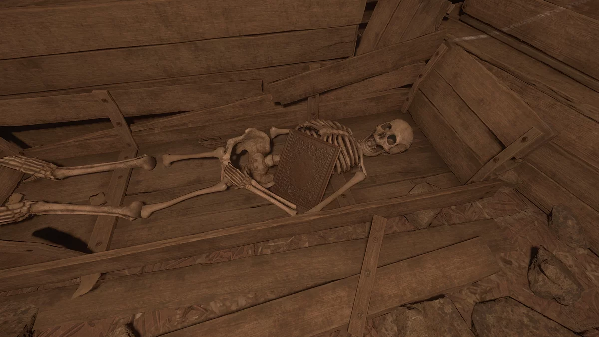 Не пропустите полезную книгу «Пир мертвецов». Она лежит под одной из деревянных лестниц, в руках скелета.