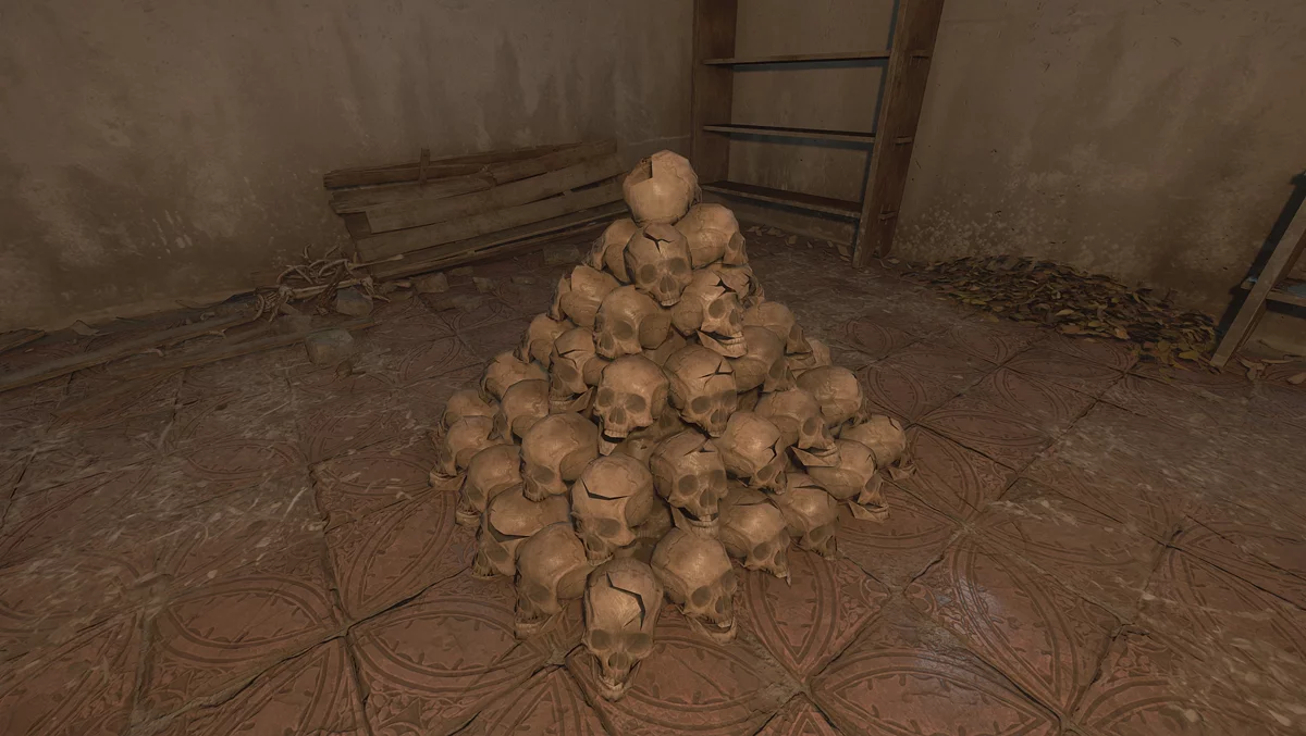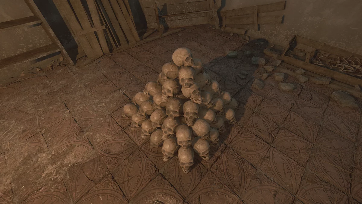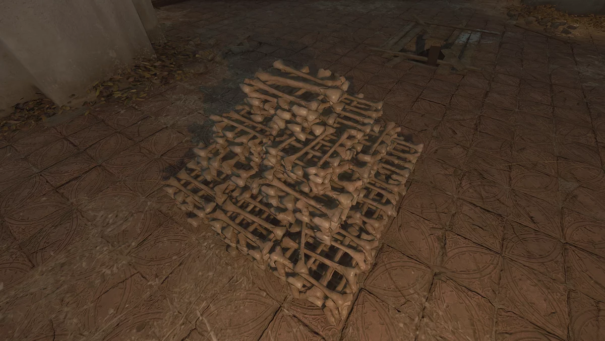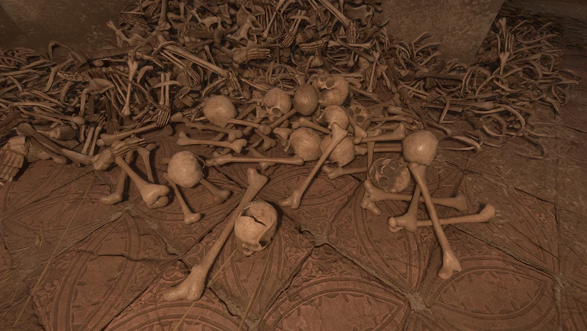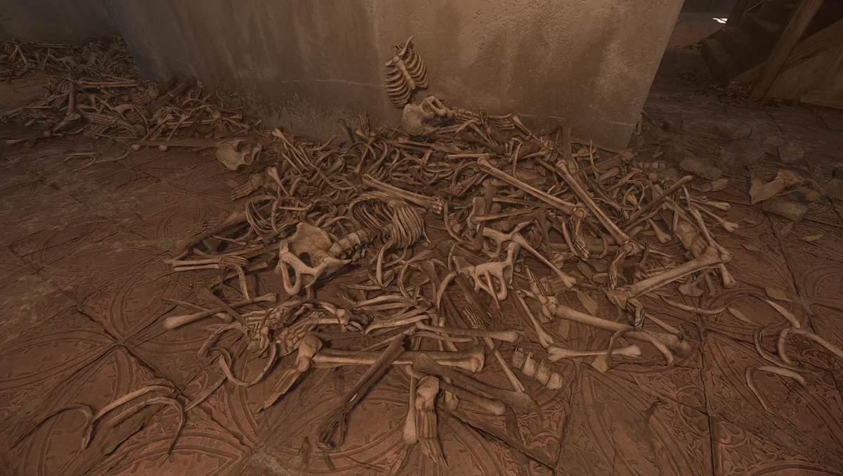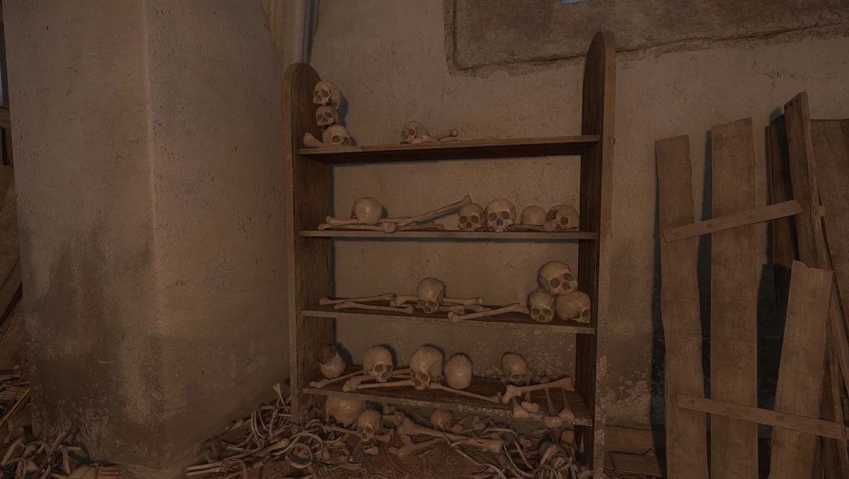 Отдельно обратите внимание на кучи, из которых потом нужно будет сортировать кости. Среди них вы отчётливо увидите крупные черепа и кости бедер. Эти кучи немного выделяются на фоне остальных и разбросаны по всему склепу: на полу, на полках и в крипте рядом с гробами.