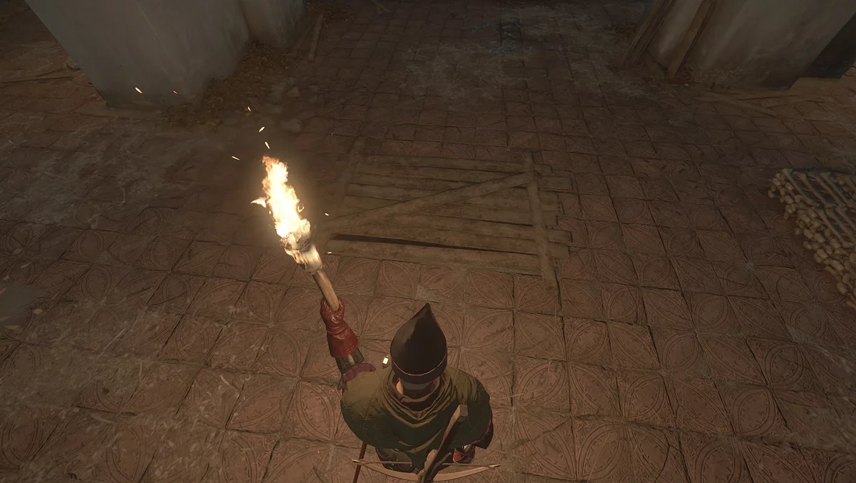 Когда убедитесь, что собрали все кости на этом этаже и убрали всё лишнее, найдите деревянный люк в полу. Взаимодействуйте с ним, чтобы провалиться в склеп. Там также соберите все кости, которые вам попадутся.