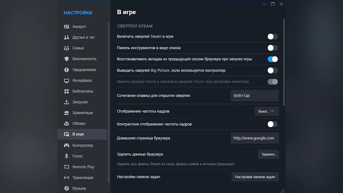 - В категории «В игре» снимите флажок рядом с пунктом «Включить оверлей Steam в игре».