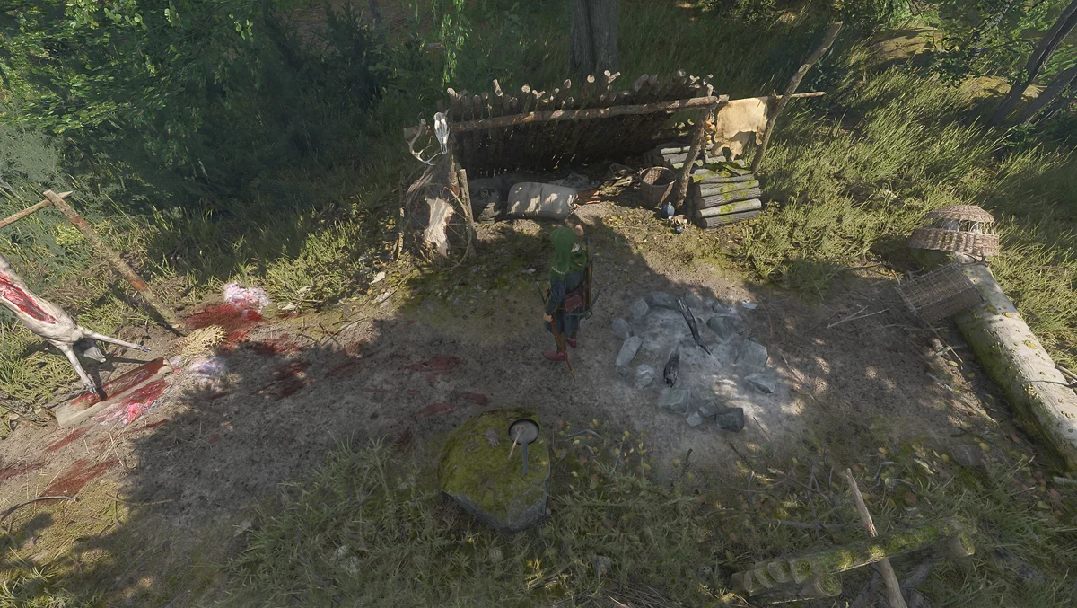 От неё идите на юго-запад до разрушенного лагеря охотника. В мешке под шалашом возьмите нож дичекрада. Рядом с лагерем бродит волк.