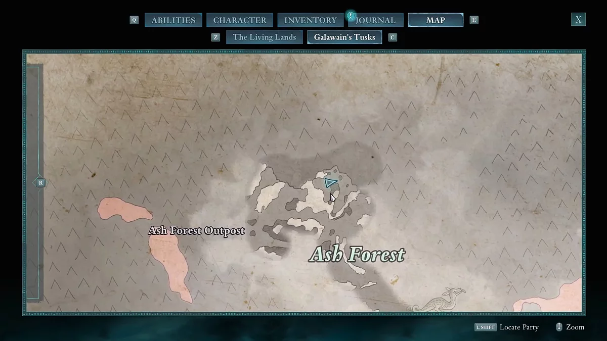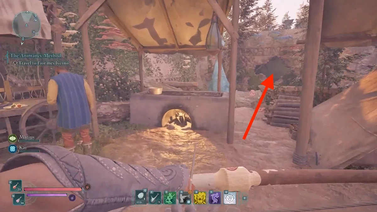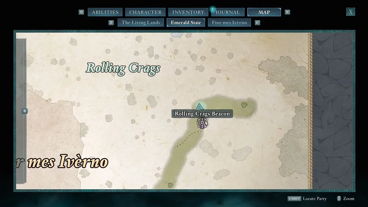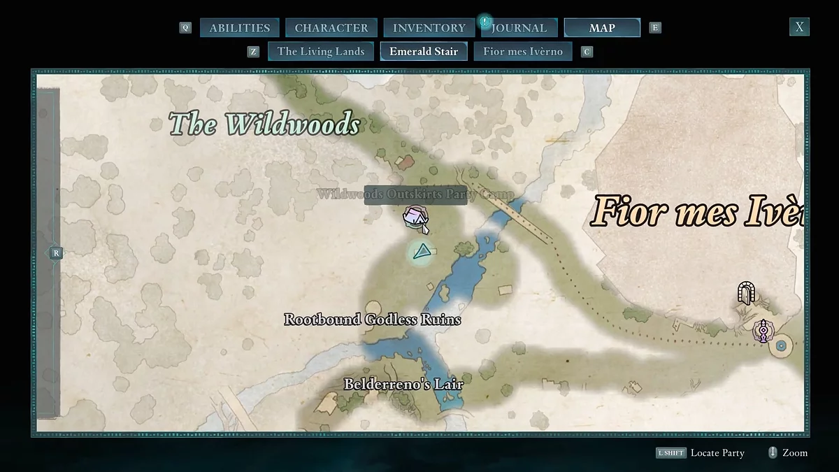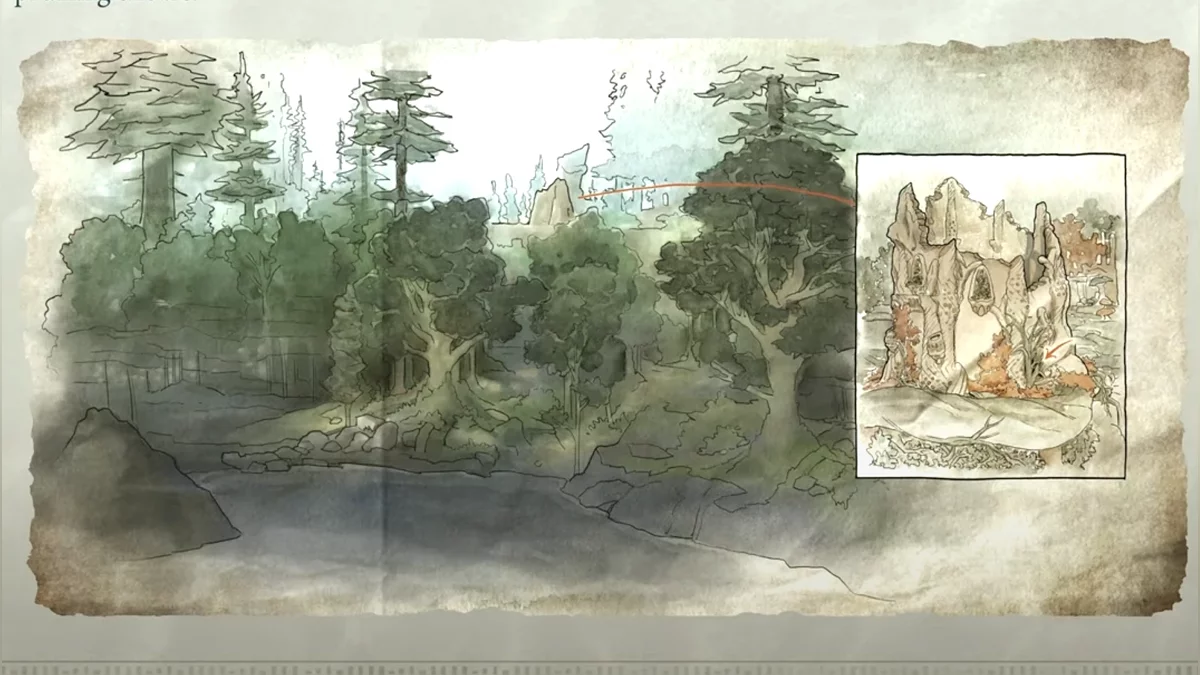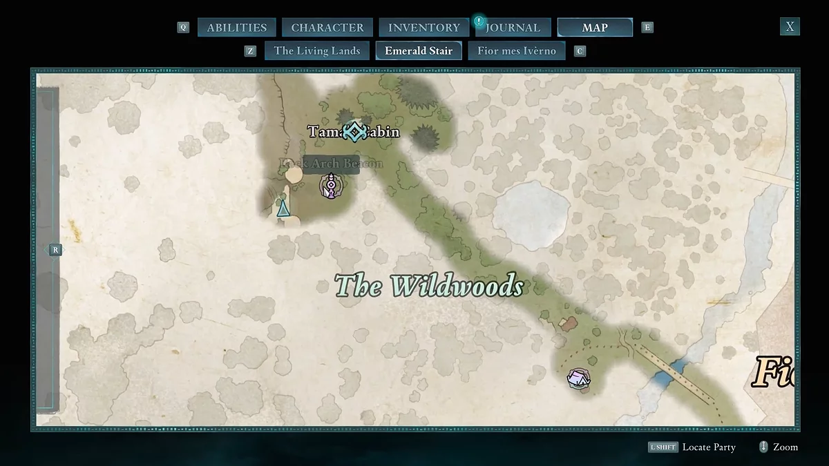 Таким образом мы попадём на открытую местность, находящуюся неподалёку от моста между Диколесьем и Фиор-Мес-Иверно. В этой же области вы можете обнаружить ещё один перевалочный пункт великолесья. Необходимо спуститься по уступам с одной из сторон с деревянными укреплениями, пока в конце концов не окажетесь рядом с сундуком художника на выступе.
